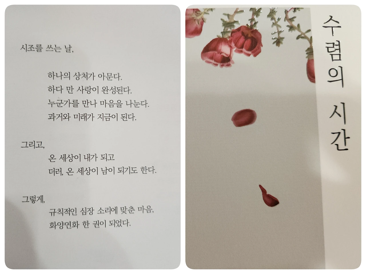 시인이자 시조시인, 그리고 수필가로 활동 중이신 지인이다. 잦은 교류가 있었던 것이 아님에도 불구하고, 작가의 친필 서명이 담긴 소중한 시조집 <수렴의 시간>을 보내 주셨다.