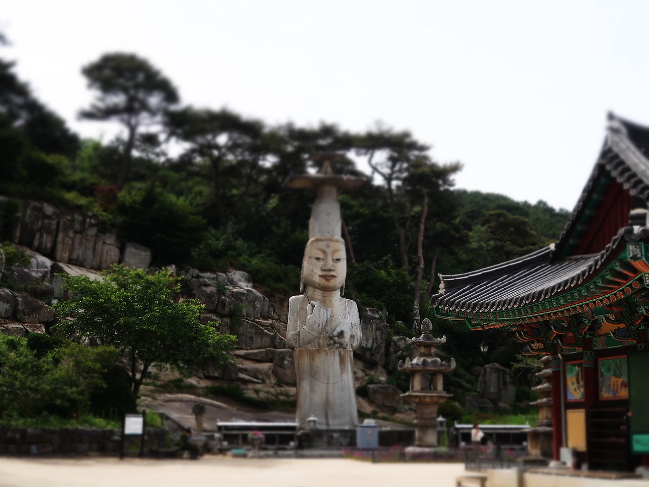 가보신 분들이 많이 계시겠지만, 이 정력왕처럼 생기신 부처님은 "은진미륵"으로 잘 알려진 논산 관촉사의 돌부처이다. 그 높이는 무려 18.2m이니아파트 7층과 맞먹는다. 고려 광종 때, 100명의 석공과 1,000명의 노역이 동원되어 목종에 이르기까지 무려 37년 간에 걸쳐 조성된 석조불인데, 시기를 살펴보면 몽고의 침략과 임진왜란, 병자호란과 6.25의 화마에도 파손 없이 잘 버텨 낸 신통력을 갖춘 불상이라고 봐야겠다. 한국에서 가장 큰 석조불상이기도 하거니와, 바로 앞에는 우리나라에서 화엄사 각황전 석등에 이어 두 번째로 큰 석등이 또 하나의 볼거리이다. 많은 사람들이 부처님 발아래에서 거대한 돌부처와 석등을 보고 돌아선다. 하지만 관촉사 은진미륵의 진수는 불상 옆에 있는 얼마 간의 돌계단을 올라 '삼성각' 앞에서 바라보는 장면일 것이다. 시원하게 탁 트인 은진 들판과 수묵화처럼 아련하게 계룡산이 멀리 조망되어 보기에 아주 좋다. 다만 근처에 마련된 벤치에 앉아 발 밑을 내려보노라면 부처님 어깨너머 멀리 보이는 속세가 참으로 답답하게 보이는 것을 어찌할 수가 없다.