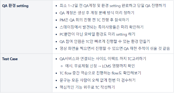 6. 2차 QA는 QA 환경 세팅이 부족했고 TC가 너무 많았음