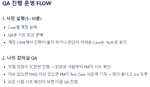 4. [TC작성 → 제비 뽑기 → QA 설명 및 진행 → Fail Case 확인 → 수정 후 재 진행] 순으로 진행