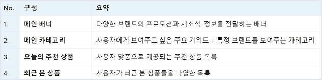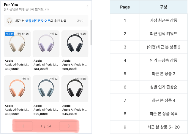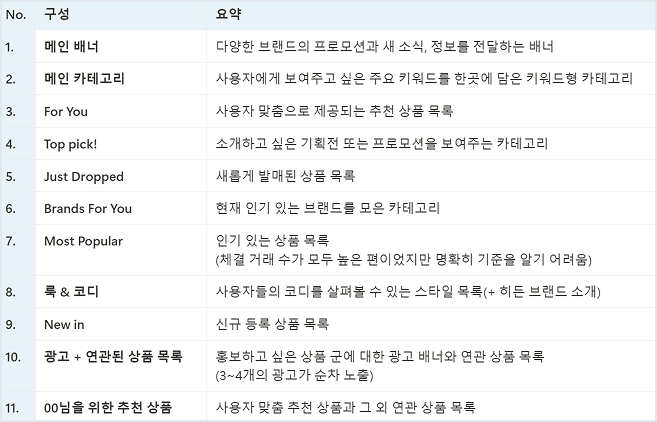 개인화된 추천에서 탐색형 추천으로, 다시 개인화된 추천으로 이어지는 구성은 목적형 유저와 탐색형 유저 모두를 효과적으로 사로잡으려는 의도가 느껴졌습니다.