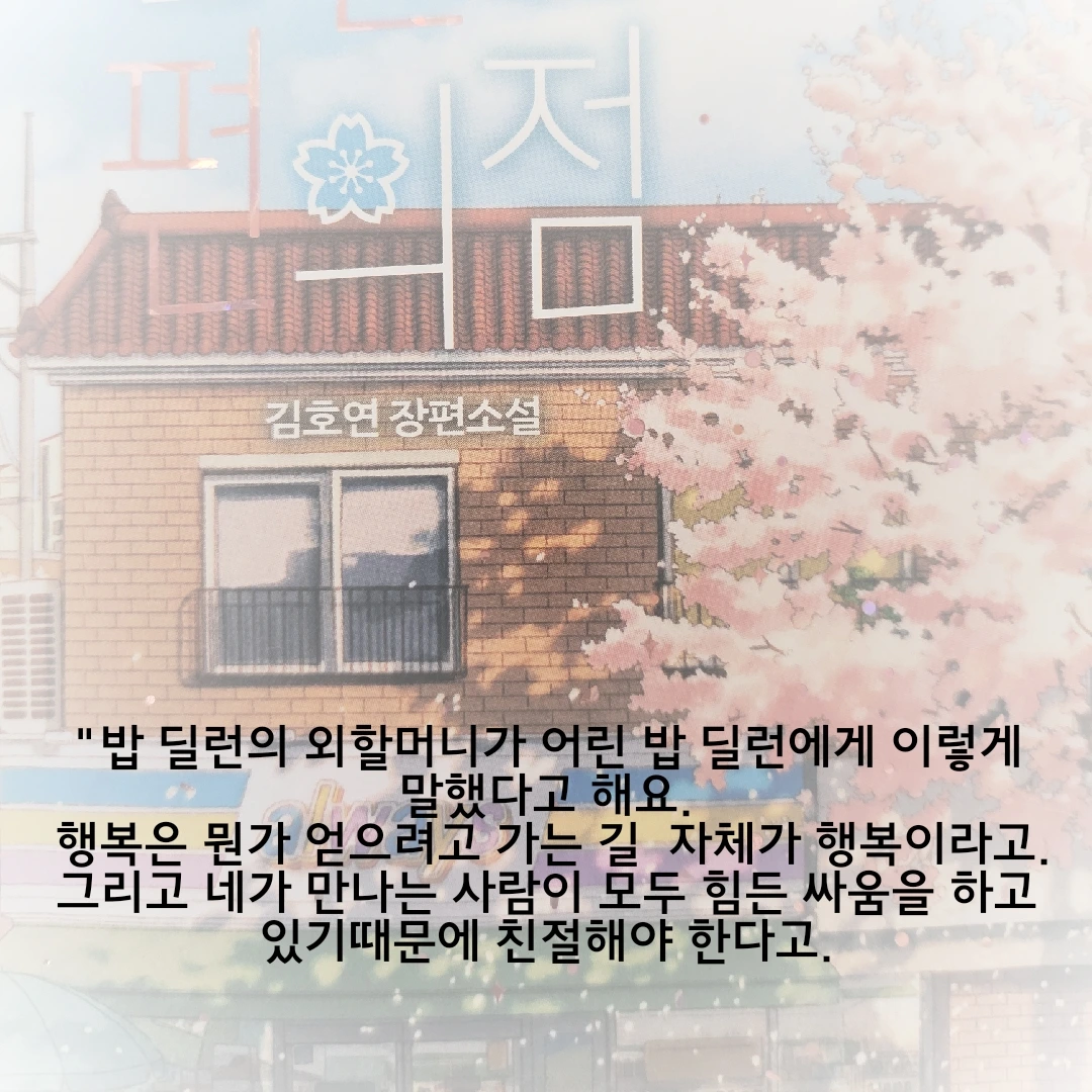 어느 날 5살 아들 하원 시간 맞추어서 어린이집 문 앞에서 기다리고 있었는데 한 남자아이가 엄마에게 달려와서 와락 안기는 모습을 보았다. 아이는 산타할아버지 크리스마스 선물 받는 듯 표정으로 기뻐했다. 엄마 또한 꿀이 떨어지듯 바라보았다. 그 모습을 닮고 싶었다. 엄마에게 다가가서 이야기를 나누고 나이가 동갑이고 책 읽기 좋아해서 급속도 친해졌다. 시간이 지날수록 우리 불편한 감정을 꺼 낼 수 있을 정도 깊은 이야기를 나누었다. 친구 엄마는 둘째가 태어나면서 첫째 아이가 애정결핍 분리불안장애로 힘들었던 이야기를 했다. 상처가 없을 거라고 나만 힘들 거라고 생각했는데..보이지 않지만 힘든 싸움을 이겨내고 현재 엄마가 되었다는 걸 알게 되었다.나도 어린 시절 아빠의 사고 , 삼촌의 아동폭력 등.. 현재 금전적 문제. 시댁의 불편한 관계를 서슴리 없이 말했다. 불편한 감정을 말하려니 방언이 터지는 듯 말했다. 말하면 안 될 거라고 했지만 오히려 말하니 마음이 가벼워지고 편안해졌다. 불편한 감정으로 가려져있던 구름이 사라지니 현재 사랑스러운 아이들의 모습이 보이기 시작했다. 그 후 감정 숨기지 않고 당당하게 표현하는 법을 배웠고 그러다 보니 웃는 날이 더 많아졌다. 거울 앞에서 말이 많아진 내가 사랑스럽게 느껴졌다.. 변화는 친구 엄마 들어주기였다. 천천히 가만히 들어주기를 통해서 깊게 상처 난 자리에 반창고를 붙여주었다. 불편한 편의점에서 가슴이 와닿는 내용이 있었다. 극작가 지망생 인경이 휘수에게 샘에게 물었다.