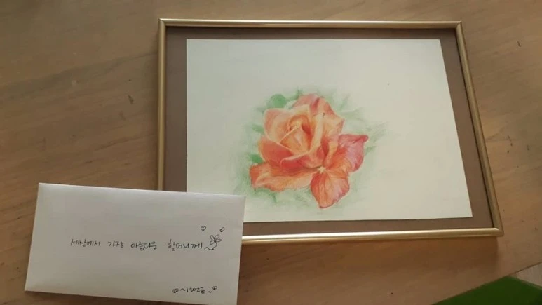 난 매일 5분 그림 그렸다. 완성이 되면 감사한 분들께도 드렸다. 받으신 분들은 행복해하는 모습을 보고 그림 그리기 잘했다는 생각이 들었다. 그중에서 기억 남는 옆집 할머님이 생각이 난다. 할머니는 아들 2명과 딸2명있었지만 혼자서 살아가고 계셨다 .아파트 복도에서 나를 만나면 마음속의 이야기를 꺼내놓으셨다. 그러다가 어느날 할머니께서 갑자기 쓰러지셨다. 할머니께서 동네 병원에 입원하셨는데 몸이 안 좋아지셔서 큰 병원으로 옮겨야 했다. 하지만 자식들은 옮기지 않았다. 자식들은 할머니의 건강보다는 돈이 먼저였다 .자식들에게 상처 받은 마음을 전해서 들으니 마음이 아팠다. 할머니의 위해서 무슨 일을 할 수 있을까? 생각을 하다가 주황색 장미꽃을 그림을 그렸다. 직접 만나서 드리고 싶었지만 할머니께서 병원에 오지 말라고 하셨다. 옆집 이모님께 전달해서 드렸다. 몇 달 후 건강해진 할머니를 시장에서 만날 수 있었다. 할머니는 내 두 손을 잡으시면서 너무 고맙다고 감사하다고 말씀하셨다. 그때 할머니의 표정을 잊을 수가 없다. 내가 그림을 그릴 수 있어서 할머니를 위로해 줄 수 있어서 감사한 마음이 들었다.