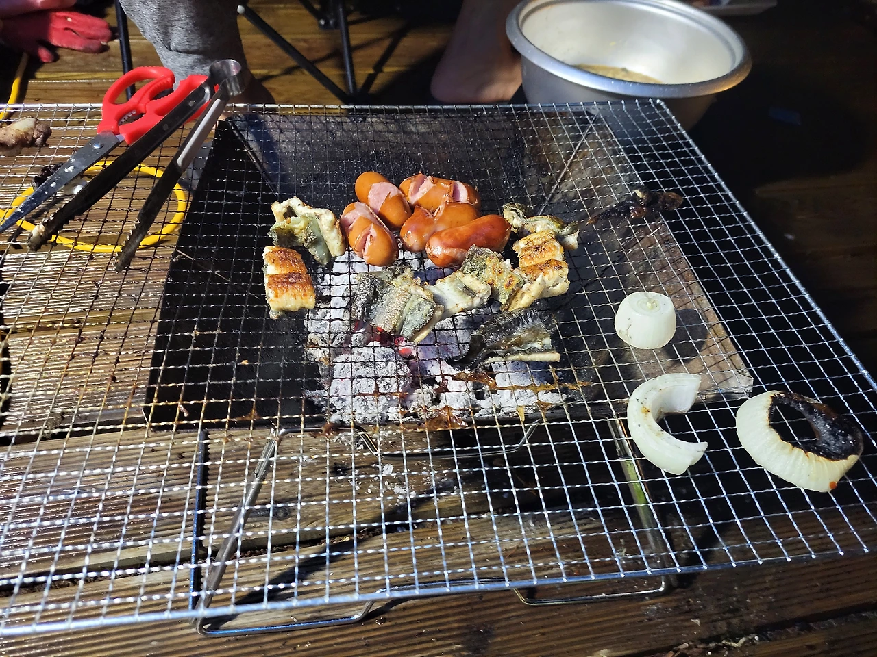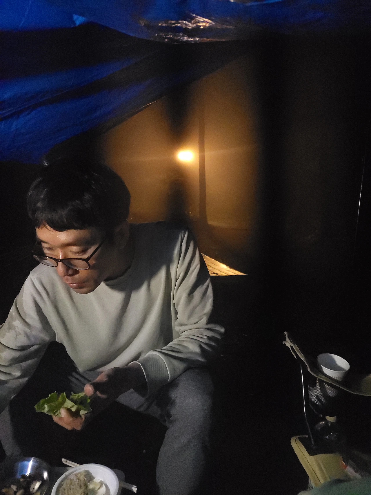 드디어 캠핑장소에 도착했는데 비가 쏟아진다. 아무 준비 없이.. 무작정 달려왔다. 5천 원으로 다이소에서 구입한 방수포를 펼쳤다. 나무에 묶고 땅에 망치로 받아서 비를 피할 수 있는 곳을 만들었다. 캠핑의 꽃은 고기다. 오늘 고기가 아닌 장어를 준비했다. 숯불장어.. 달콤한 상상 했다. 맛있게 구워지는데 풀벌레이들이 천막이나 모여들었다. 벌레를 싫어하는 나는 젓가락을 놓았다. 텐트를 피고 그 안에 누워있고 싶다. 하지만 비는 계속해서 쏟아졌다. 그러다 비가 멈췄다. 화장실이 가는 길 영화 세트장처럼 안개가 자욱하다. 비가 오고 벌레들이 있어서 짜증이 났는데 풍경. 빗소리에 밥을 먹으니깐 감성이 젖는다. 시간이 갈수록 비가 점점 내렸다.