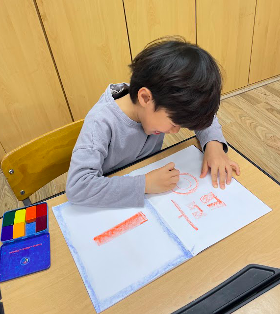 첫번째 시간은 한글을 만나는 시간. 지난 번 '하늘' 글자를 배웠다면 오늘은 '땅'과 '사람' 글자를 만나는 시간이었다. 이제 어느 정도 사각 밀납크레용에 적응하기 시작했다. 테두리를 그리고 가운데 글자를 굵게 그리고, 세종의 한글이 세상의 이치를 담고 있다는 것을 보고 읽고 생각하는 시간으로 보냈다. 시작이 천지인이다보니 조금은 무거웠지만, 다음주부터는 이 글자를 바탕으로 소리 글자의 원리를 만나면서 듣기와 말하기, 쓰기와 놀이가 겹쳐지면 훨씬 분위기가 살아날 것이다. 오늘 천지인을 익히는 시간 끝에 이런 말을 덧붙이니 새롭게 다시 자기 이름을 보기 시작했다.
