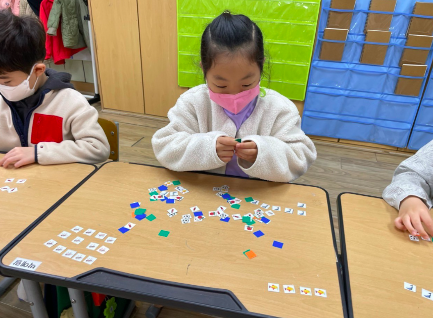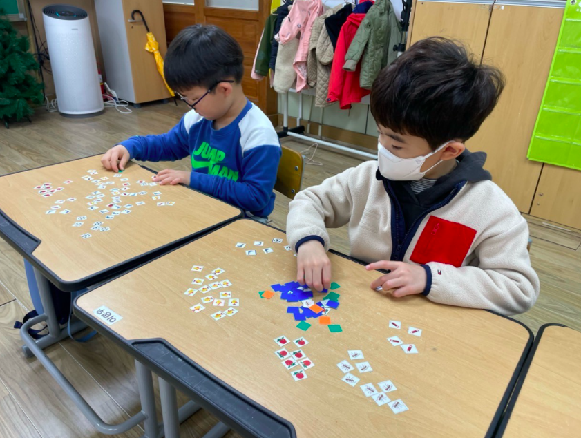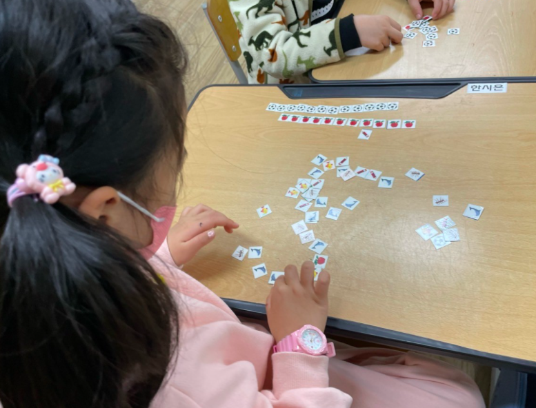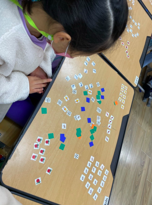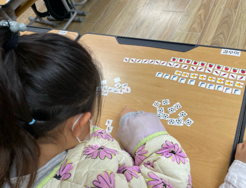 작은 손으로 작은 카드를 손가락 하나로 옮겨 놓고 줄을 세우는 모습이 얼마나 귀뎝던지. 어떤 아이는 한 줄로 늘어 놓기도 하고 어떤 아이는 단을 나누어 늘어놓기도 했다. 또 다른 아이는 세상에 모은 카드로 해당하는 개수만큼 숫자로 나타내는 게 아닌가? 어제도 기발하게 분류한 도형조각으로 택배차도 만들어내던 아이라 이 수업을 하면서 그 아이의 남다른 감각에 새삼 감탄을 하기도 했다. 다들 같은 그림으로 뷴류를 다 한 걸 확인한 다음에는 같은 모양 중 가장 마음에 드는 그림을 다섯개만 다시 모아 보라고 했다. 그 다음으로는 그림이 10개가 되는 걸 찾아 한 번에 보기 좋게 놓아 보라고 했다. 하지만 몇몇 아이들이 이 말을 이해하지 못했다.