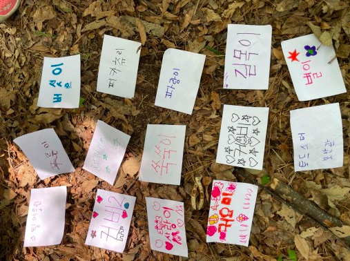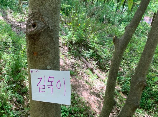 그렇게 된 뒤에 친구들의 나무이름과 위치를 각자 외우다가 붙인 라벨지는 떼어와 교사에게 가져온다든 것. 교사는 바닥에 쫙 펼쳐놓고 다시 위치와 이름을 확인하게 하고 마침내 아무 이름을 불러 아이들로 하여금 불린 이름의 나름을 찾아 빨리 가게 한다는 것. 그러게 해서 제일 먼저 간 아이는 2점, 나머지는 1점으로 매기며 놀이를 즐기게 하자는 것. 이런 과정을 아이들은 무척이나 재미있게 즐겼다. 그리고는 자기 나무를 일 년 내내 지켜보며 봄 여름 가을 겨울을 알뜰살뜰 챙길거라는 다짐도 해 보았다. 조금은 경사가 있는 곳에서 한 놀이여서 아이들이 살짝 넘어지기도 하고 나뭇가지에 찔리기도 했는데, 여기서 이야기 하나가 만들어졌다. 우리 반에서 제법 인기가 있는 한 아이가 나뭇가지에 찔려 울음을 터뜨리며 주목을 끌 즈음이었다.