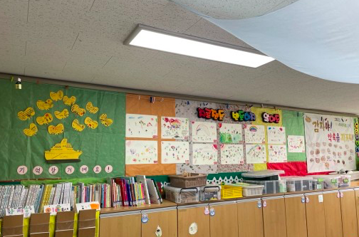 그렇게 완성한 작품에 우드록으로 만든 작은 이름도장을 찍어주며 게시판에 붙여 나갔다. 시간이 모자라 중간놀이 시간에도 남은 뒷작업은 내 몫이었다. 그때 6학년 아이들이 들어와 1학년과 놀더니 내가 하는 작업에 관심을 보이며 도와주어 고마웠다. 그렇게 모든 작업을 마치니 중간놀이 시간은 이미 끝났고 나는 다시 3-4교시 수업으로 들어가야 했다. 교실로 들어온 아이들은 저마다 자기 작품이 예쁘다고 자랑스러워 했다. 못난다고 하는 것보다 나으니 그냥 인정해줬다. 하하하. 수업을 마치고 나서 게시판에 붙인 오늘 작품을 보니 모두 그 아이답다는 생각이 든다. 4월 말일이 되어서야 겨우 뒤 게시판은 모두 채워졌다.