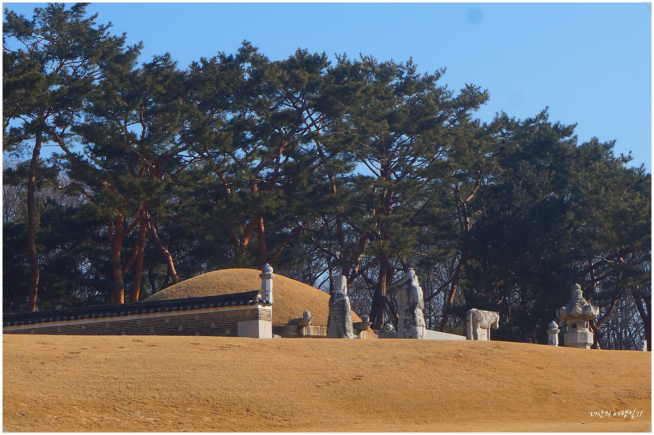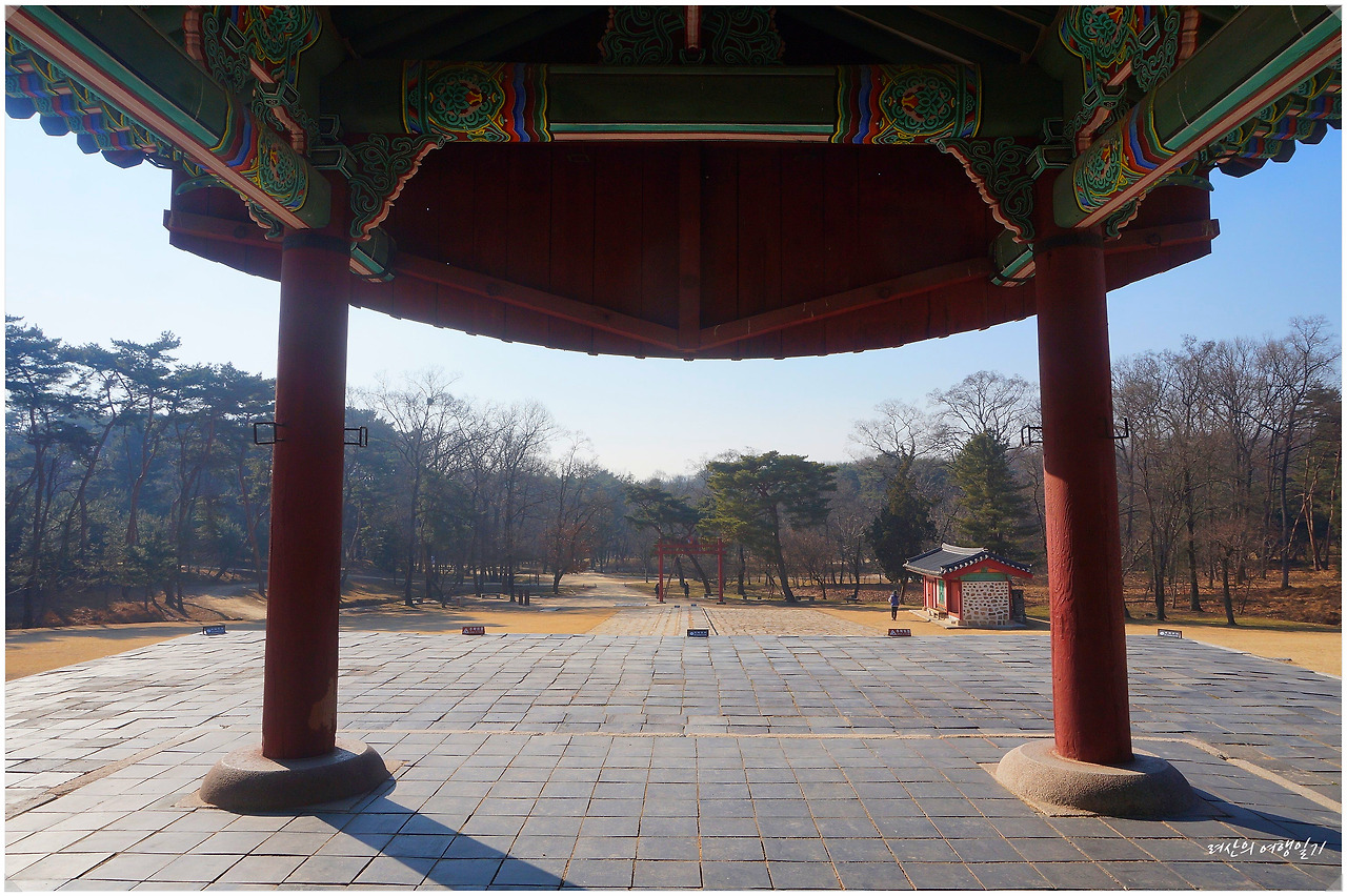 왕릉의 소나무 숲길 사이로 들어오는 햇빛이나 등산할 때 나무들 사이로 들어 오는 햇빛은 내가 제일 좋아하는 빛이다. 특히 겨울철의 따사로운 햇빛은 보는 이들로 하여금 추위를 잊게 만드는 것 같다. 그리고 신책길로 가면 융릉의 비경을 볼 수 있었지만 출입문 오른쪽을 경유하여 건릉에 도착 하였다.