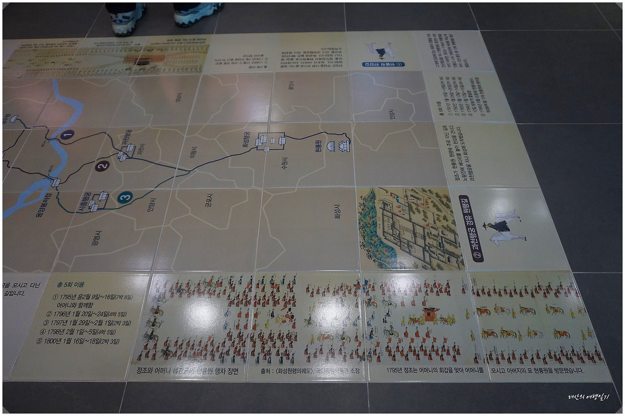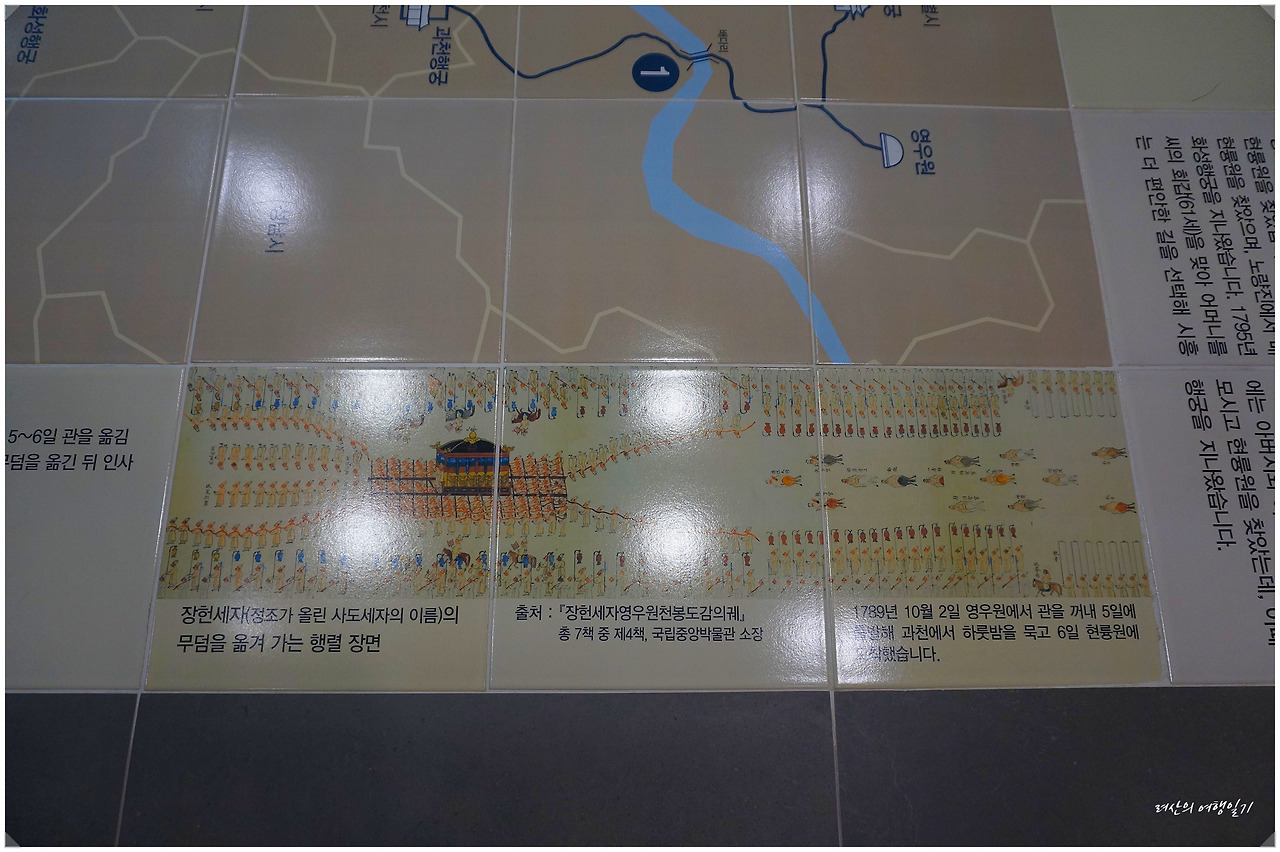정문을 지나면 '융ㆍ건릉' 역사 문화관이 우리를 반겨주는데 이곳에는 정조 임금이 아버지인 사도세자(장조)를 찾기 위한 행렬 과정이 자세히 기록되어 있다. [정조의 현륭원 가는 길 - 한양에서 화성까지 행차도]당시 수도 한양에서 융릉에 가기 위해서는 한강을 건너는 것이 가장 큰일이었다. 그래서 정조 임금은 한강을 건널 수 있는 배다리를 이용 하여 쉽게 건널 수 있었으며 이후에는 더 편안한 길을 선택하여 시흥 행궁으로 가게되었다.