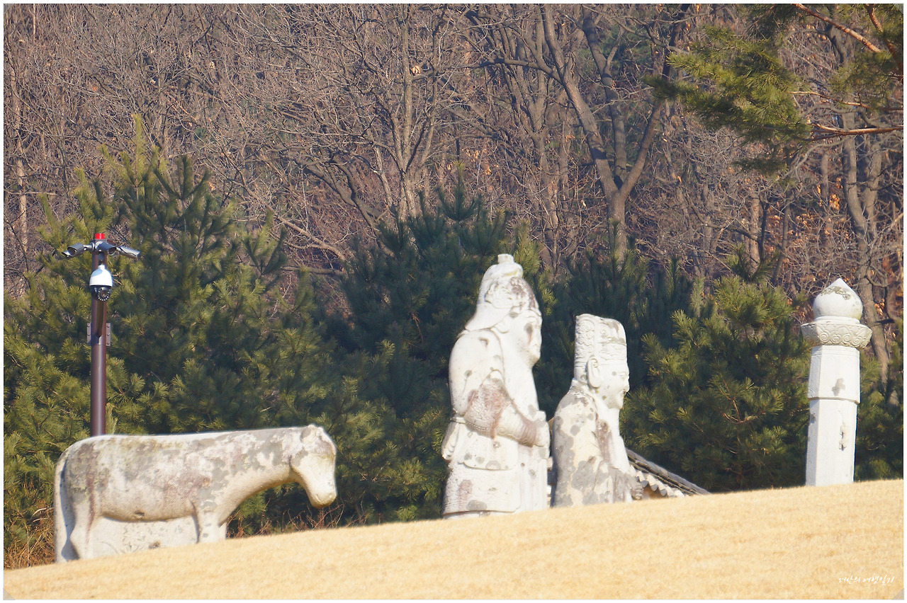 카메라 줌을 당겨 보았는데 다른 왕릉과는 차별화 된 융릉('장조'와 '헌경왕후')이 한눈에 들어 온다. (* 단릉 / 합장릉 : 둘 또는 혼자 잠들어 있는 무덤) 융릉 앞의 석조물이 '문석인'과 '무석인'이 '석마' 등이 정교하게 조성이 되어 있음을 볼 수 있었다. 융릉을 보면서 그 모진 세월을 아들로서 아버지로서 어떻게 버텼을까? 차라리 일반 사가에서 태어났더라면 힘들게 살지 않았을텐데, 하지만 그의 운명은 조선 최고의 권력자의 아들로 태었났으니 그것도 그의 복이 아닐까 생각이 되었다.