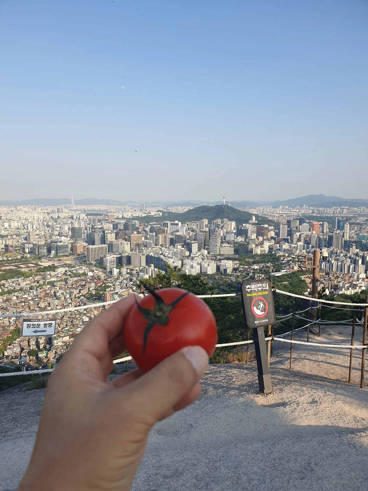 휴식 시간 포함하여 여유 있게 정상에 도착하였다. 정상에서 맛보는 토마토 과히 꿀맛이다. 높은 산은 아니지만 서울의 내사산중에서 대중교통으로 접근하기 좋은 산중에 하나다. 또한 이곳에서 바라보는 서울의 풍경은 과히 아름다우며 강남의 롯데타워와 남산타워 여의도에 있는 한화생명이 한눈에 들어온다.