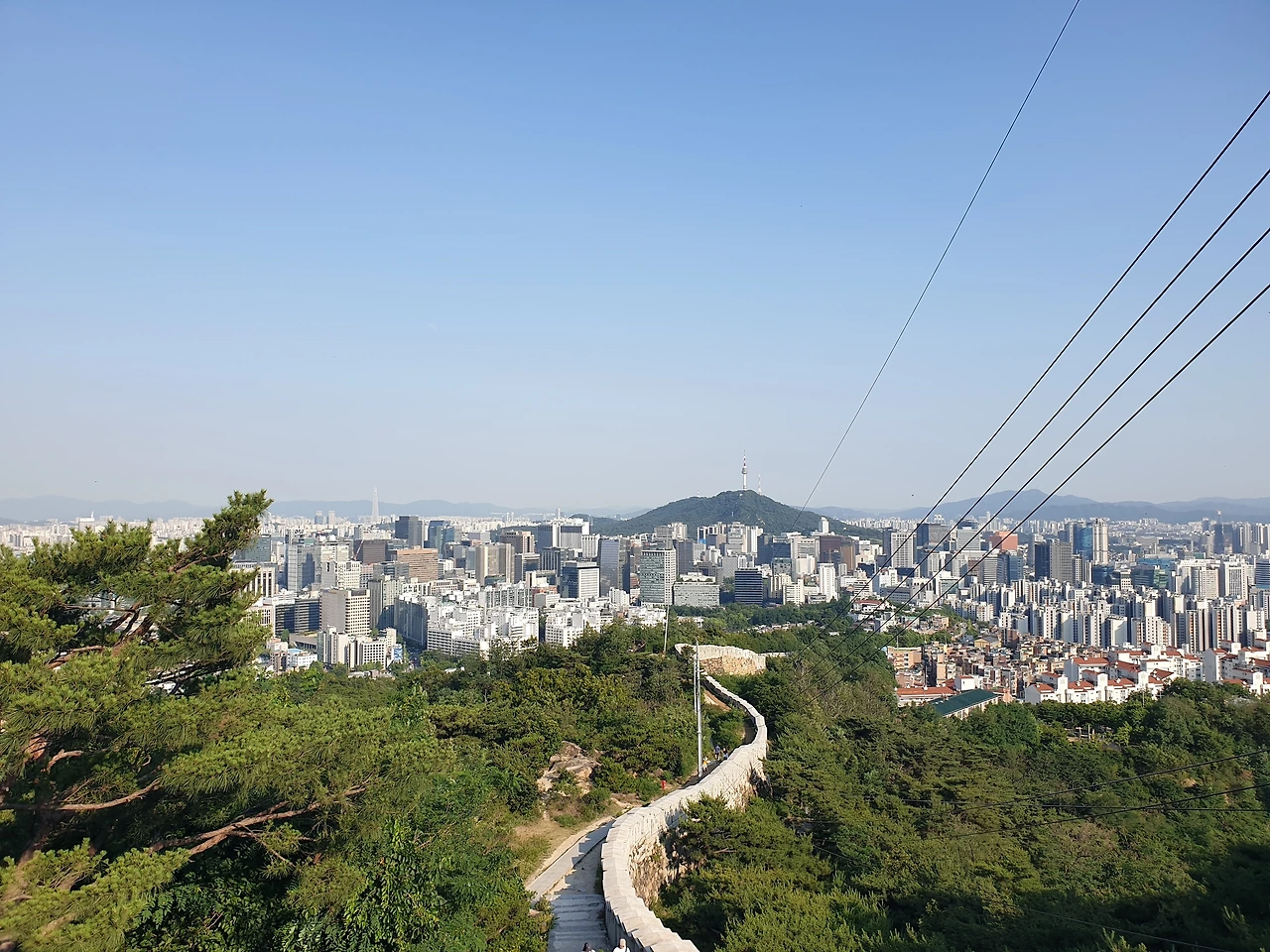 나무 계단을 지나 약 5분 ~ 10분 정도 걷다가 뒤를 돌아보면 아름다운 성곽길과 서울 도심이 한눈에
