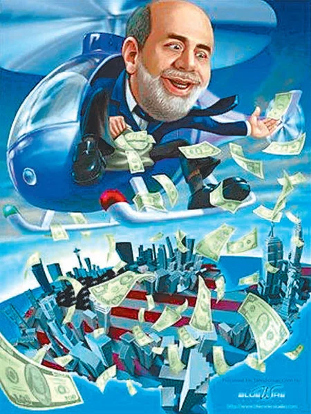 지금은 너무나 유명한 이 풍자만화는 당시의 연준 의장인 벤 버냉키가 한 공세적인 양적완화 정책에 대해 그가 헬기를 타고 달러를 마구 뿌리는 모습을 표현한 것입니다.