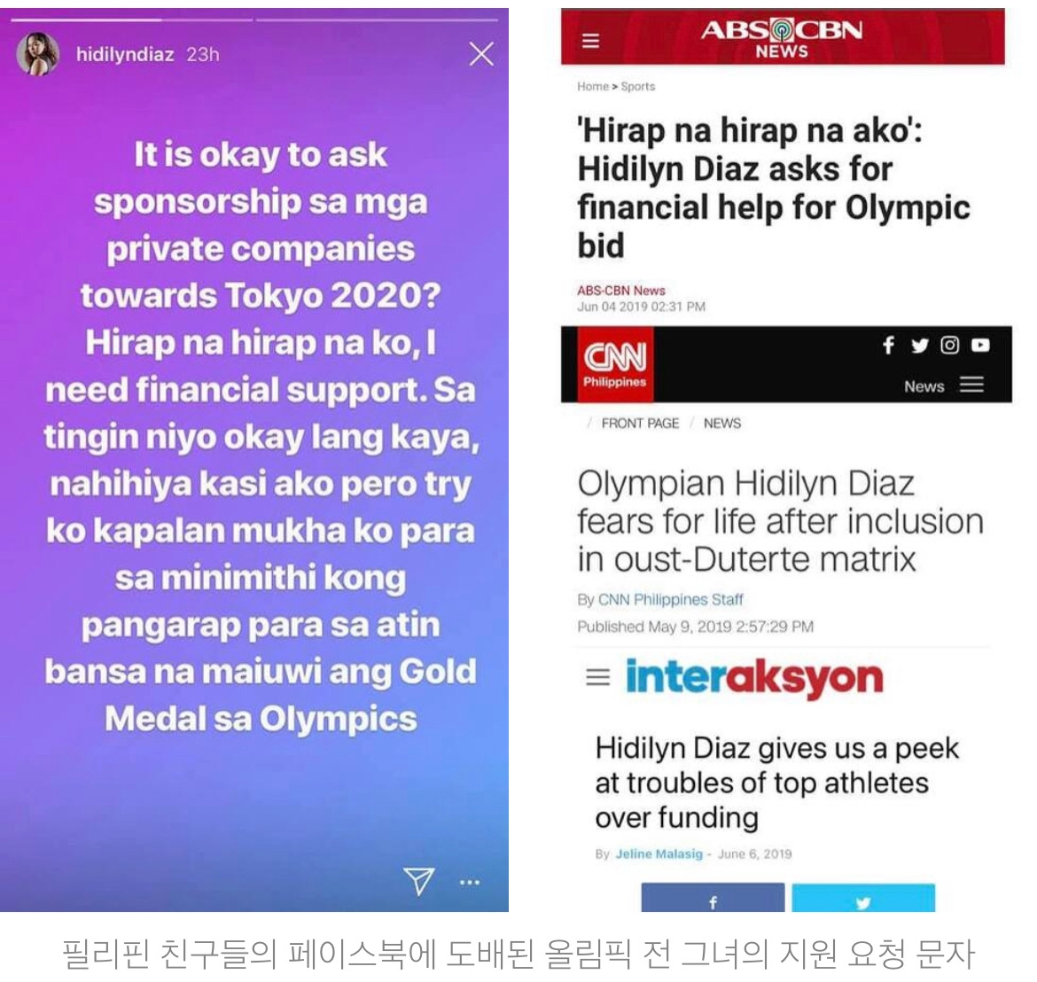 내가 처음 그녀에 관한 피드를 읽게 된 것은 바로 올림픽 출전 전에 올렸던 그녀의 개인 피드였다. 필리핀 현지 매체가 인용한 그녀의 글 중 제목에서 언급된 'hirap na hirap na ako'라는 따갈로그의 뜻은 '제가 정말 정말 어렵습니다.'라는 의미인데 본문의 내용과 함께 덧붙이자면 그녀는 도쿄 올림픽에 꼭 나가고 싶은데 기업이든 개인이든 아주 작은 도움이라도 꼭 얻을 수 있다면 도쿄 올림픽에서 금메달을 꼭 가져오겠다고 도움을 요청하는 글이었다.