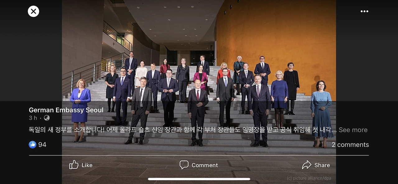 지난해 16년간 시민들의 선출을 통해 임기를 이어갔던 메르켈 총리가 퇴임하고 새롭게 선출된 독일 총리 및 행정부의 장관들이 찍은 첫 단체 사진이 독일 대사관 페북에 올라왔다.