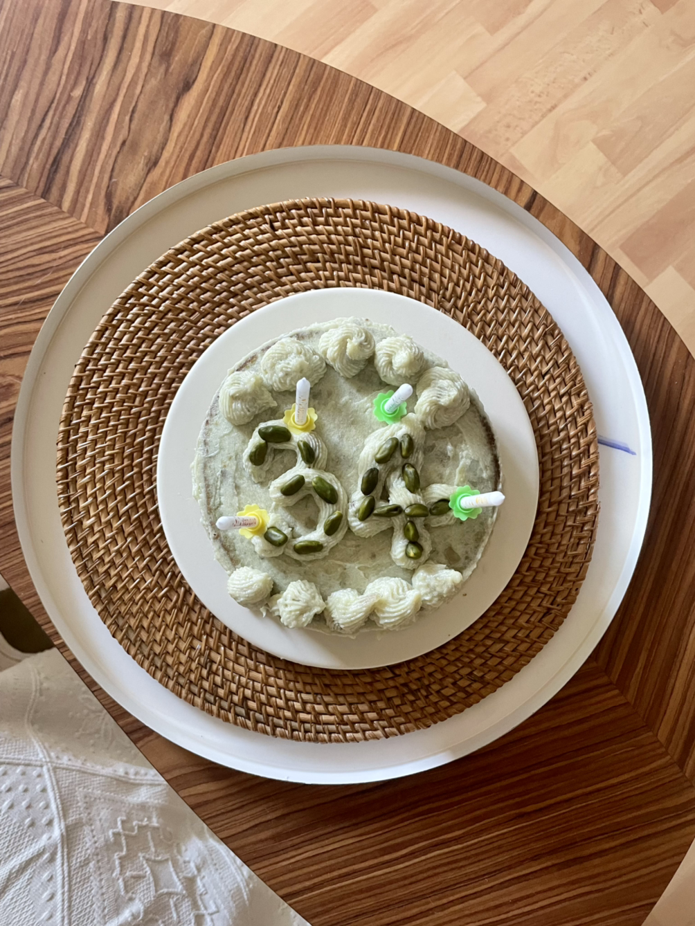 그렇게 차분한 노래와 화면을 담은 녹차제누와즈 만들기 영상을 따라 빵을 구웠는데, 어랏, 한 번에 성공한 것 같았다. 완벽하진 않았지만 그래도 가운데 크림을 바를 수 있게 두 세번은 자를 수 있는 크기로 부풀어 오른 것 만으로도 나에겐 무척 큰 성공이었다. 제누와즈가 열기를 식히는 동안, 고구마를 삶아 으깨고 식혔다가 크림을 섞어 케이크를 꾸밀 준비까지 완료. 남편이 집에 오는 시간에 맞춰 제누와즈를 꺼내 크림을 삼단으로 바르고 마지막으로 케이크 표면을 장식하려고 하는데 막상 무엇을 어떻게 꾸며야 하는지 멍해졌다. 남편은 계단을 올라오고 있는데, 문을 열면 짠하고 보여주고 싶은데, 얼른 떠오르는대로 급하게 적고 문을 열고 들어오는 남편에게 짜잔하고 보여줬다.