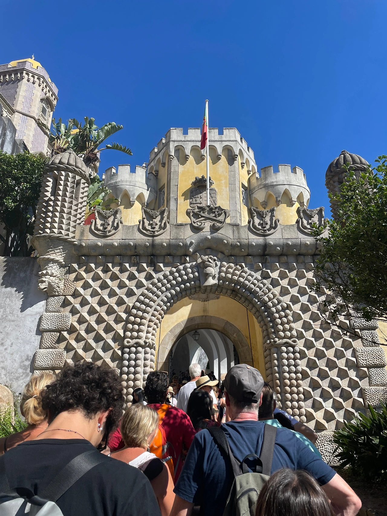 단단히 긴장을 하고 페나성 입구를 지나갔는데 뭔가 작은 언덕의 정원이 나타났다. 정원의 길은 모두 페나성의 진짜 입구로 올라가는 길로 향해있었는데, 생각보다 많은 사람들이 있던 것은 아니었다. 그렇게 어디에 페나성이 있는지 둘러보며 천천히 사람들이 향하는 언덕 위로 올라갔다. 이윽고 작은 버스 정류장이 있는 언덕 중턱 즈음에 버스에서 사람들이 우르르 내리더니 어딘가를 향해 줄을 서고 있었다. 눈앞에는 사진에서만 보던 페나성의 샛노란 성벽이 보이고 새빨간 시계탑이 보였다. 롯데월드의 성처럼 성문 뒤로 사람들의 줄이 길게 늘어서 있길래 우리도 그 뒤를 따라갔다. 이 성문이 아저씨가 말한 성문인가 보다 하고 생각해보니 생각보다 사람들이 많은 것은 아닌 것도 같았다. 이대로라면 티켓에 적힌 대로 11시 30분 안에는 페나 성문 안으로 들어갈 수 있을 것 같았다.