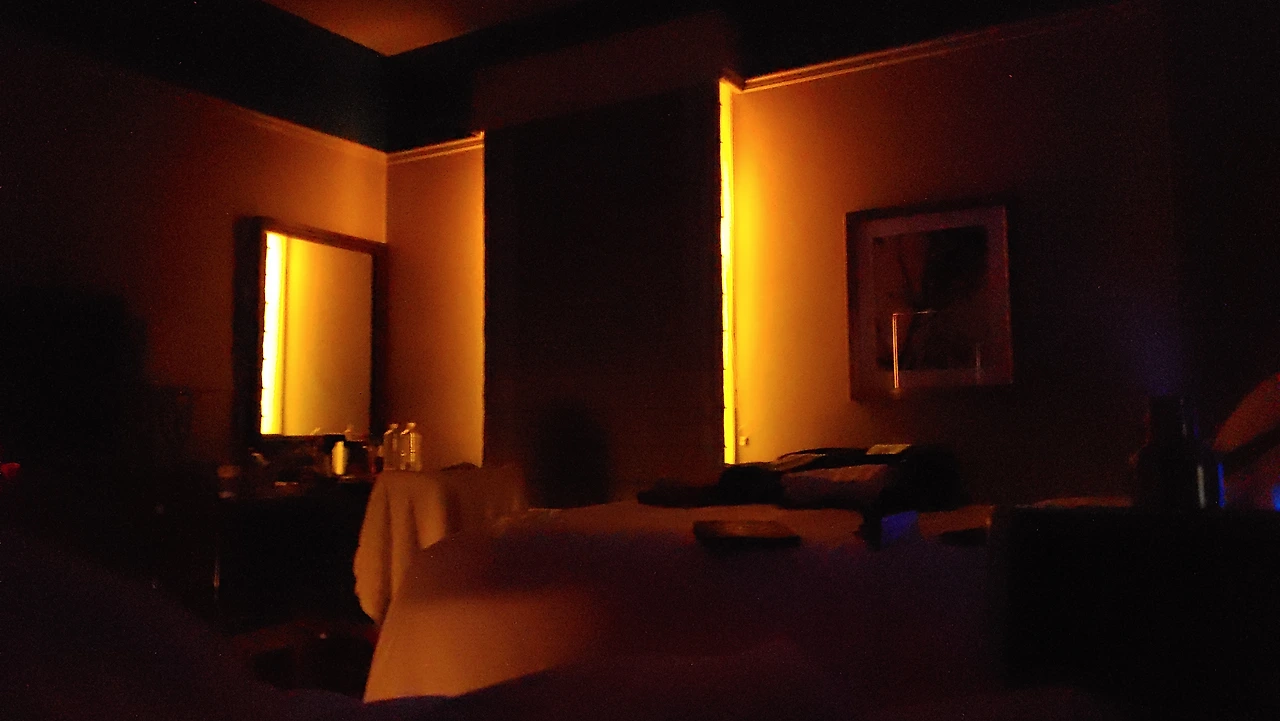 객실 문의 바닥 쪽 틈을 비집고 들어온 복도의 노란빛,