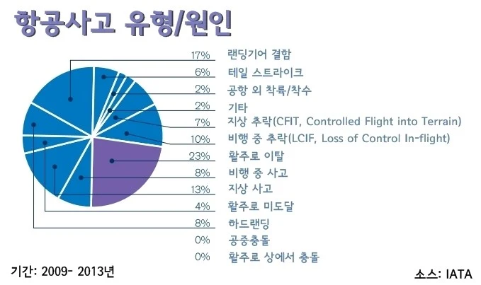 8%: 다른 인간적인 실수(항공관제 실수, 항공기의 과적, 잘못된 정비, 연료의 오염, 의사소통의 문제 등)