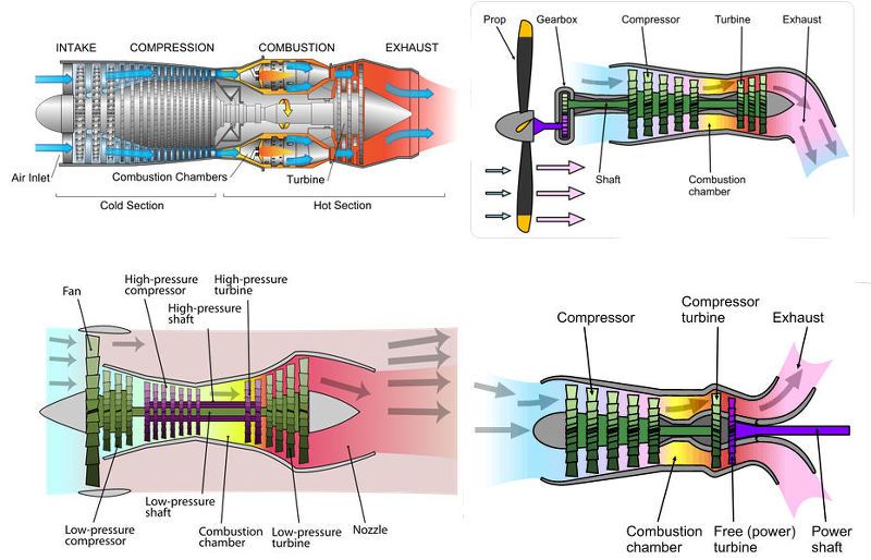 Gas turbine 엔진의 종류. 좌측 위는 turbo-jet. 1970년대까지 개발된 전투기와 여객기에 채택, 우측 위는 turbo-prop으로 터빈을 돌려서 프로펠러를 돌림. 저속 특성 우수로 인해 군용 수송기와 단거리 이착륙 소형 여객기에 사용(STOL) 좌측 아래는 turbo-fan 엔진으로 1970년대 말 이후 개발 완료된 전투기와 여객기에 사용. 우측 아래는 turbo-shaft. 헬기나 선박, 탱크 등에 사용됨