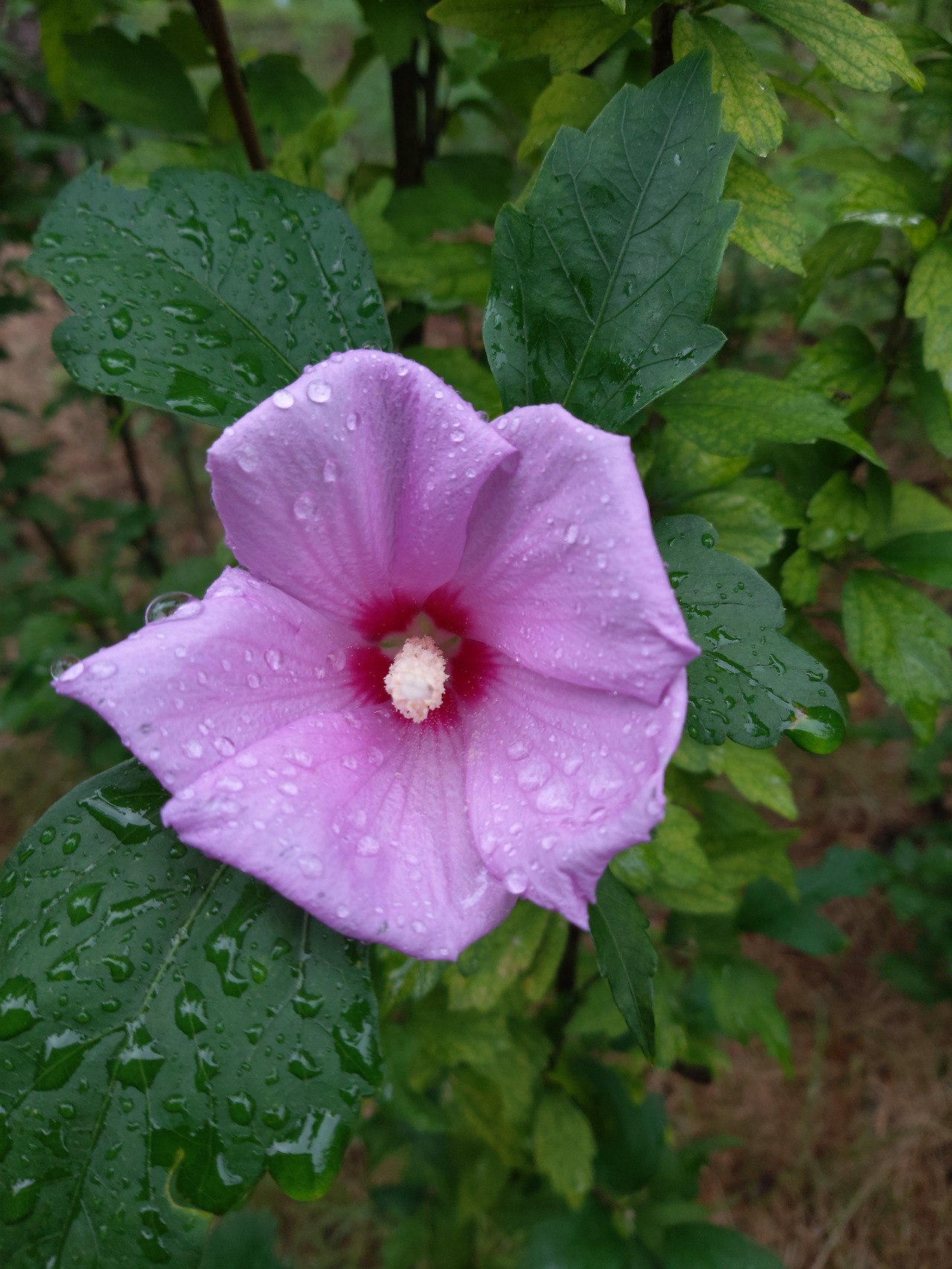 갖가지 여름꽃들과 나무들이 빗방울을 머금고 함초롬히 촉촉합니다. 유난히 눈에 띄는 무궁화 꽃이 나를 부릅니다. 폰의 음악 잠시 작동 정지시키고 한걸음에 달려가 카메라에 담습니다. 파란 잎은 물기 어려 더 짙푸르고 분홍빛 꽃망울은 고개 살짝 숙이고 있었습니다. 비가 내리지만 태풍 오기 전의 찌물쿠는 날씨에 꽃님도 지쳤나 봅니다. 나른하게 처져있죠.