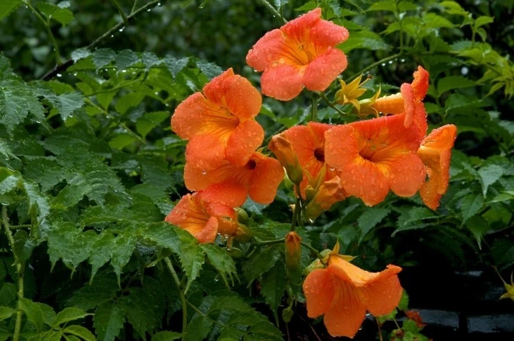 무궁화를 뒤로 하고 한참을 걷다 보니 주홍 빛깔의 꽃이 손짓합니다. 애련하게 피어있는 능소화입니다. 주홍빛 꽃잎에 초록빛 잎새에 누군가의 그리움이 방울방울 맺혔나 봅니다. 능소화 하면 떠오르는 전설의 구슬픈 사랑이야기 때문에 빗방울이 애잔한 눈물로 비치나 봅니다. 그 옛날에 궁녀인 소화가 왕을 기다리다가 난 자리에 핀 꽃이 능소화라고 합니다. 사랑과 기다림의 꽃이죠. 또 옛날에는 양반집에서만 키울 수가 있다고 해서 양반꽃이라고도 합니다. 그래서 경주와 같은 남쪽 지방의 고즈넉한 옛날 양반 고택의 담벼락에 많이 피어있는 것이 유난히 눈에 뜨였었나 봅니다. 화사하게 어여뻐 보이지만 왠지 슬프게 보이는 능소화입니다.
