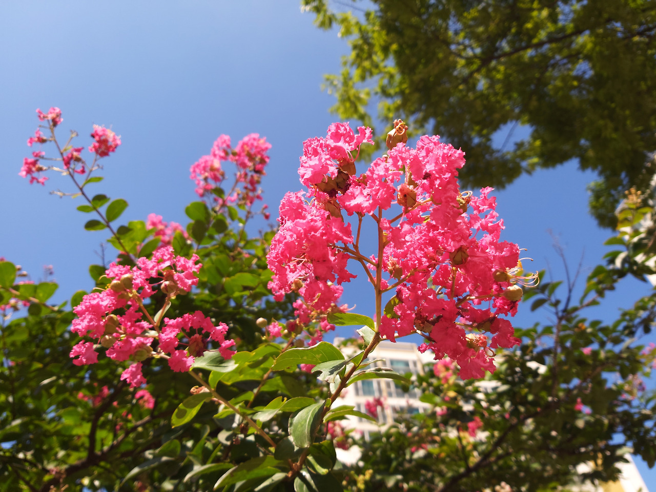 며칠 전 옆 동네 어떤 분이 9권이나 되는 책을 내놓았는데 만원을 초록어린이재단에 기부하고 책만 가져가면 된다고 합니다. 한참 동안 요지를 이해 못해 어벙벙했습니다. 인터넷 뱅킹 같은 거 통 모르고 사는 내가 인터넷으로 단돈 만원이라도 이체할 줄을 모르니 답답할 노릇이죠. 생각 끝에 내가 책 받을 때 그 현금을 드리면 받아서 대신 기부해주면 안 되냐고 하니 순순히 그러자고 하더라고요. 야호, 배낭을 메고 옆 동네로 향했습니다. 알려준 아파트 건물 앞에 도착해서 한참을 기다려도 아무도 안 보입니다. 문자를 넣었더니 책이 무게가 좀 있는데 당연히 지하 주차장으로 오는 줄 알고 이미 주차장에서 대기 중이라고 합니다. 남의 동네 대형 아파트 단지 안에서 지하주차장 입구를 찾는다는 것이 또 난감하게 되었습니다. 책을 건네줄 분이 자신은 약속 있어 급히 외출해야 한답니다. 딸한테 책을 보낼 테니 꼼짝 말고 그 자리에서 대기하라고 합니다. 현관 앞에서 기다리며 서성이고 있는데 내 눈을 사로잡는 것이 있었으니 바로 이 불타는 배롱나무 꽃이었습니다.