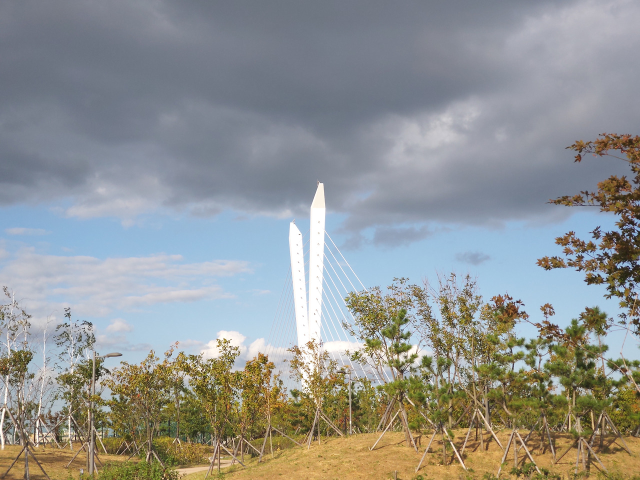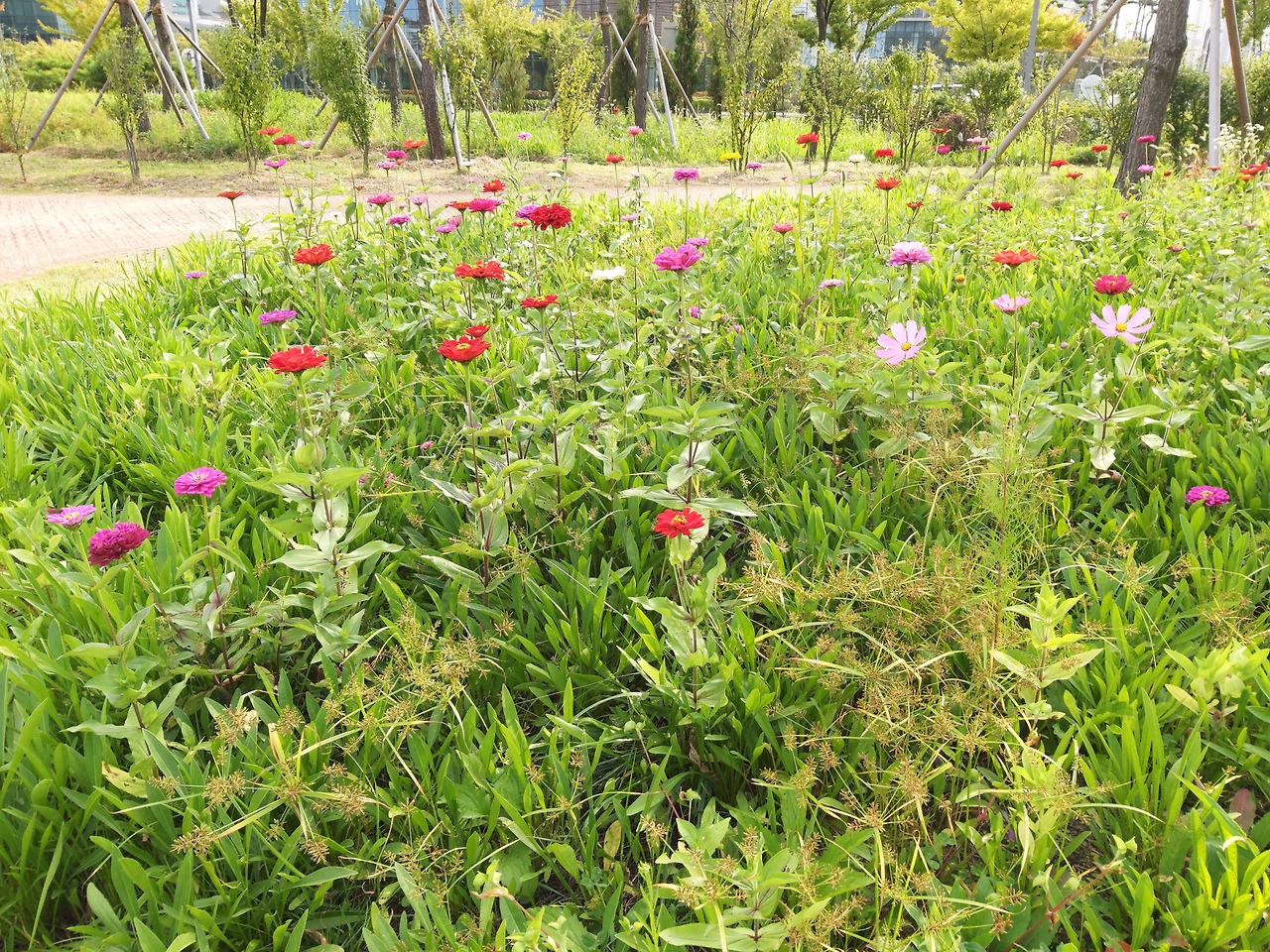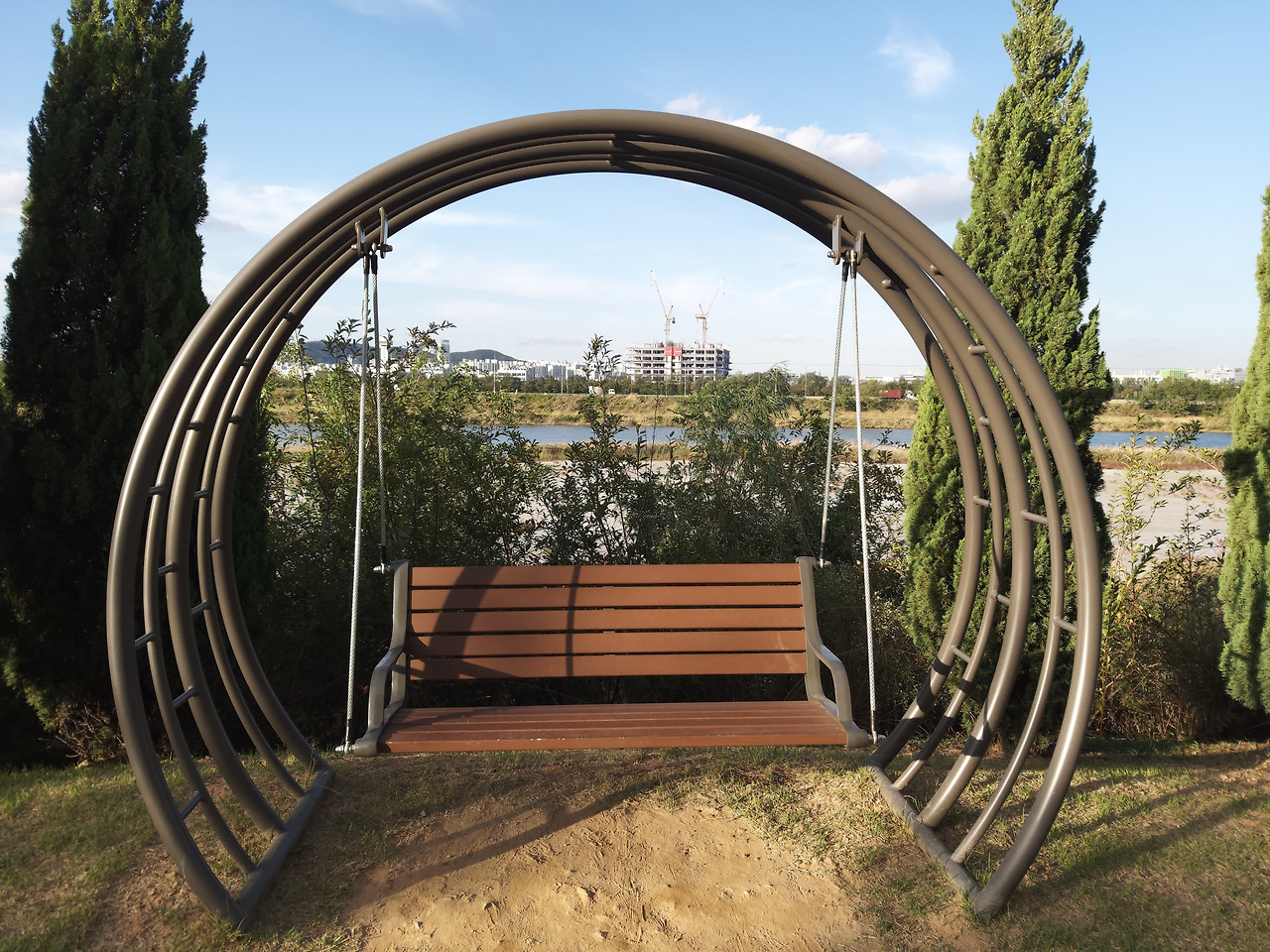 오늘도 예전처럼 흔들 벤치에 앉았다. 주변에 지나다니는 사람이 없으니 큰 폭으로 흔들거린다. 워낙 한산한 운동코스인지라. 흙과 모래가 뒤섞인 비포장길이 시골길 같아 걸을 때 자박자박 소리가 정겹고 은근하게 향수를 자극하는 산책로가 맘에 쏙든다. 거의 동네 아파트 놀이터의 아이들이 노는 그네 수준으로 훠이훠이 쌩쌩 타며 해맑은 동심으로 돌아간다. 맞은편 풀숲에 백일홍과 코스모스가 질서 없이 뒤섞여 바람에 하늘하늘 춤을 춘다. 역시 가을꽃들이 빛깔도 곱고 진하게 화사하다. 깔끔하게 피어있는 구절초, 저 멀리 먹장구름과 파란 하늘을 동시에 이고 하얀 다리가 눈에 들어온다. 명암이중천(明暗两重天)을 연출하고 있는 하늘의 모습이다. 복잡하고 착잡하게 돌아가는 현실상과 맞닿은 듯하다.