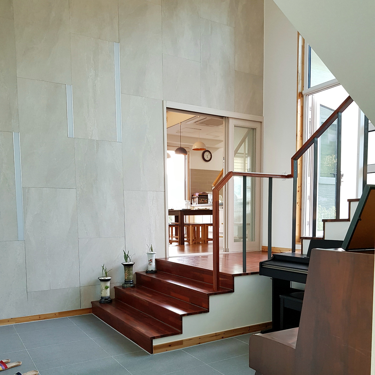 심한재 계단홀-일층 부부 영역과 이층 손님 영역을 나누는 계단홀, 거실이 두 영역의 가운데 있어서 공적인 영역으로 쓸 수 있다.