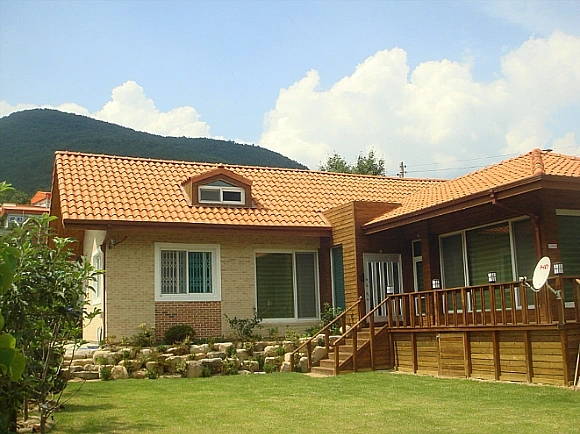 길을 굽이 돌아서면 지붕과 함께 집의 몸채가 보인다. 앞으로 나온 곳은 거실과 주방이고 물러서 보이는 큰 몸채에 안방과 전통구들로 만든 황토방, 서재가 있다. 벽은 점토벽돌로 옷을 입히고 지붕은 붉은 스페니쉬 기와를 얹어 골조는 콘크리트라도 옷은 자연 소재로 입혔다.
