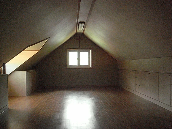 안채의 지붕 아랫 공간을 활용한 다락공간인데 스무 평 가까이 나오는 잉여 공간이다. 경사진 아랫부분에는 서랍장을 두고 나머지 공간은 다목적으로 활용할 수 있도록 배려하였다. 손님이 많을 때는 침실로, 앞으로 이 집에서 살아가면서 취미공간도 될 것이며 쓰이지 않는 여러 가지 물건은 이 공간에 모두 수납할 수 있으니 일층의 공간 효율이 충분히 발휘될 것이다.