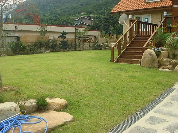 한옥은 잔디가 없는 맨땅의 마당이어서 작업공간으로도 쓰였지만 이 시대에는 땅을 누리는 공간으로 쓰기 위해 잔디로 옷을 입힌다. 잔디가 깔린 마당, 이 시대 단독주택의 가장 중요한 요소가 된다. 깔끔하게 잔디를 잘 관리하며 사는 건축주는 부지런한 성품을 가지신 게 분명하다.
