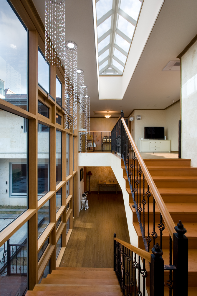 거실채가 단층이고 침실동이 이층이라면 중심홀은 공용 공간과 사적 영역으로 나누는 매개 공간이 된다. 침실채의 일층은 부부가 쓰고 이층은 아이들이나 손님이 쓰게 되니 층으로 구분이 된다. 중심홀은 세 영역을 나누면서 이어주는 역할을 수행하면서 식구들이나 손님의 프라이버시를 확실하게 지켜주게 된다.