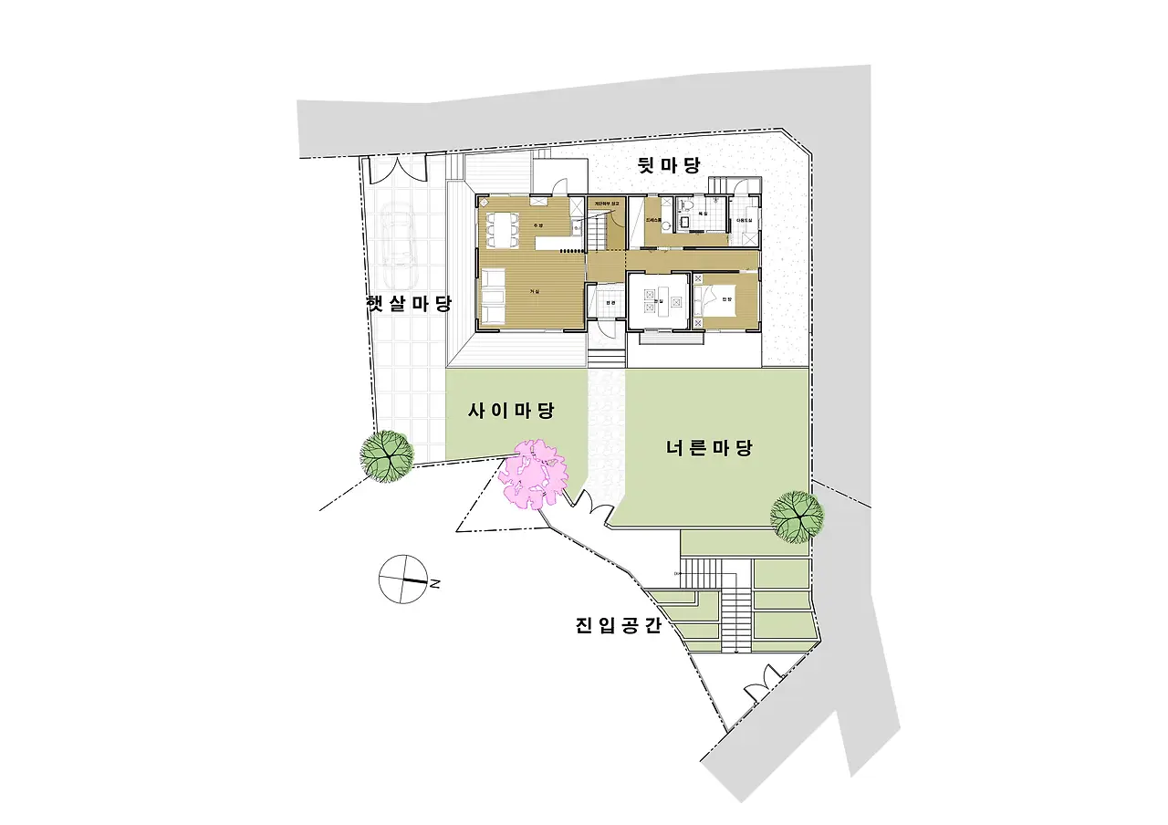 마당이 넓으면 좋겠지만 집을 쓰는 데는 작은 외부 공간을 곳곳에 두어서 내부 공간과 연계해서 쓰는 게 좋습니다. 넓은 마당은 보기에만 좋을 뿐 쓰임새가 별로 없고 관리만 힘이 들 뿐입니다. 내부 공간과 외부 공간이 닿아 있으면 한정된 실내를 확장해서 쓰는 효과가 좋지요.