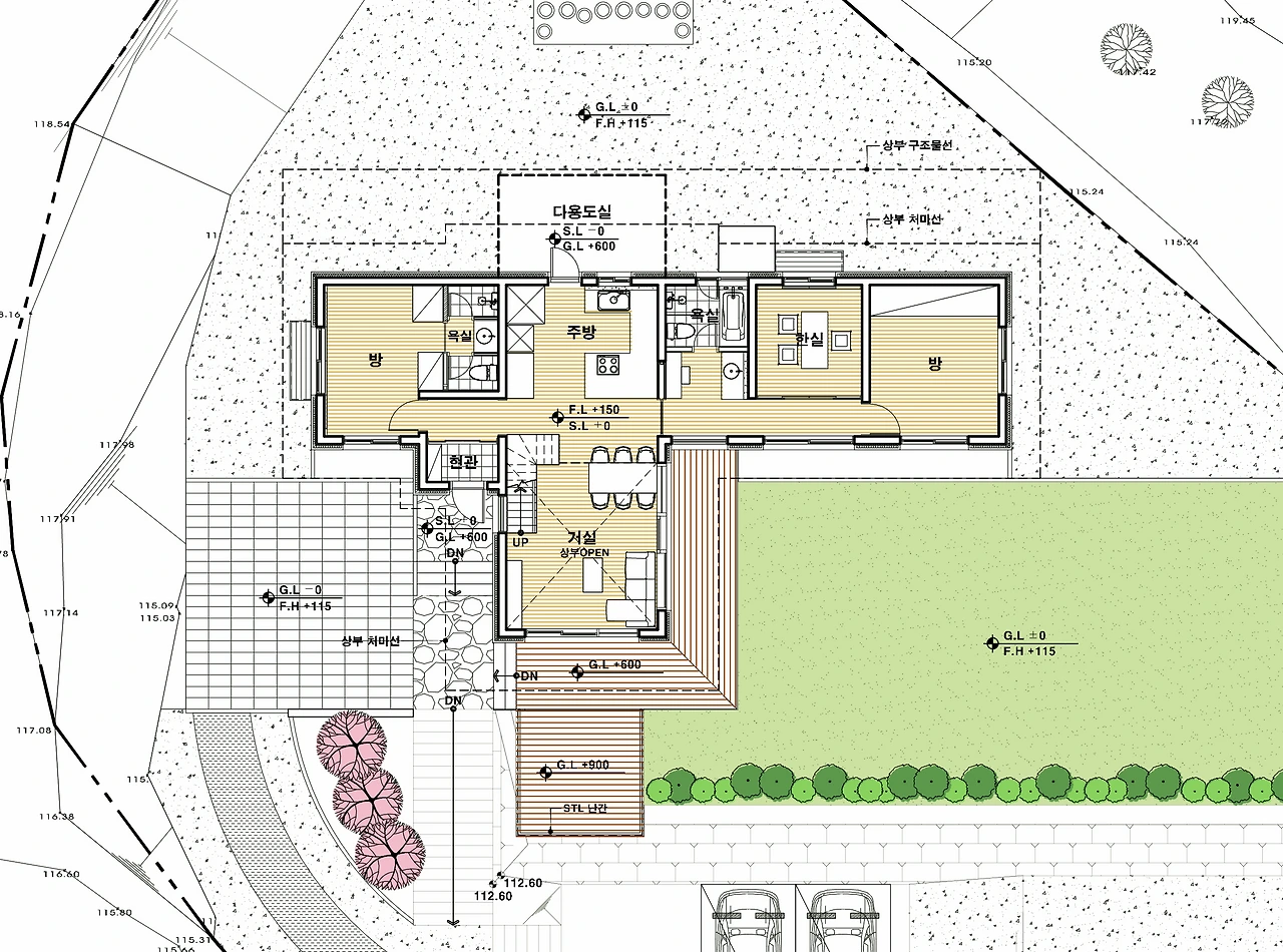 동녘길 단독주택은 모든 여건에서 만만찮은 한계를 안고 시작하게 됩니다. 이번에 진행된 경계 측량의 결과에서도 북쪽의 도로가 우리 대지를 많이 점유하고 있다는 걸 알게 되었습니다. 하지만 행복하게 살 수 있는 우리집을 지어내겠다는 의지로 설계 작업에 최선을 다해 봅시다.
