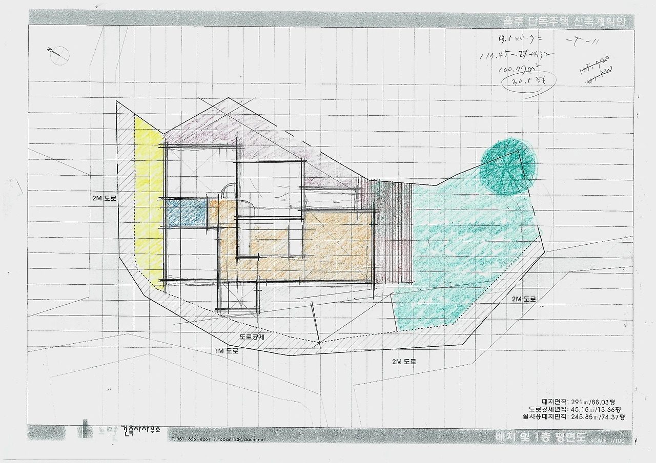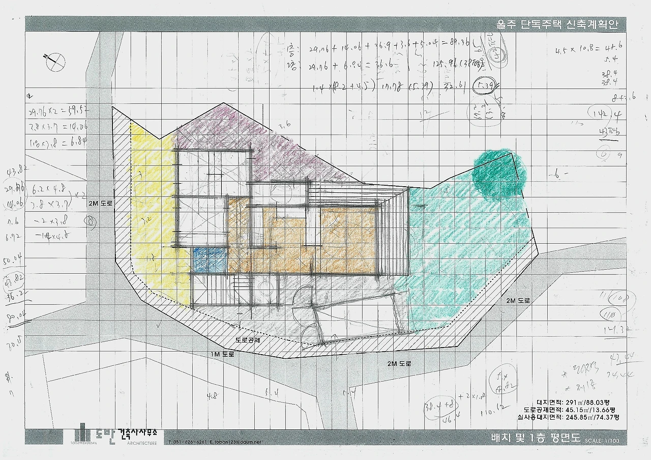 단독주택 설계를 시작하면서 가장 먼저 하는 일은 대지이다. 엄밀하게 말하자면 대지와 주변의 조건을 살피는 것이다. 대지의 모양과 향, 대지에 면한 주변과의 관계를 파악하면 집을 앉히는데 필요한 사항이 도출된다.