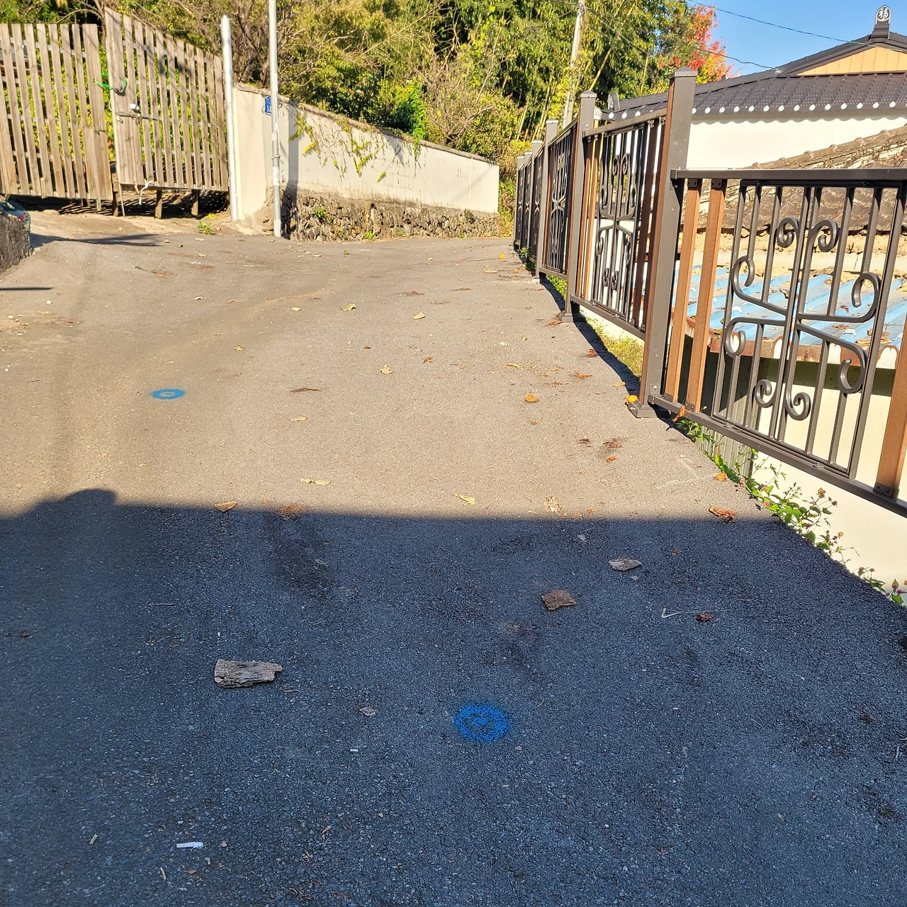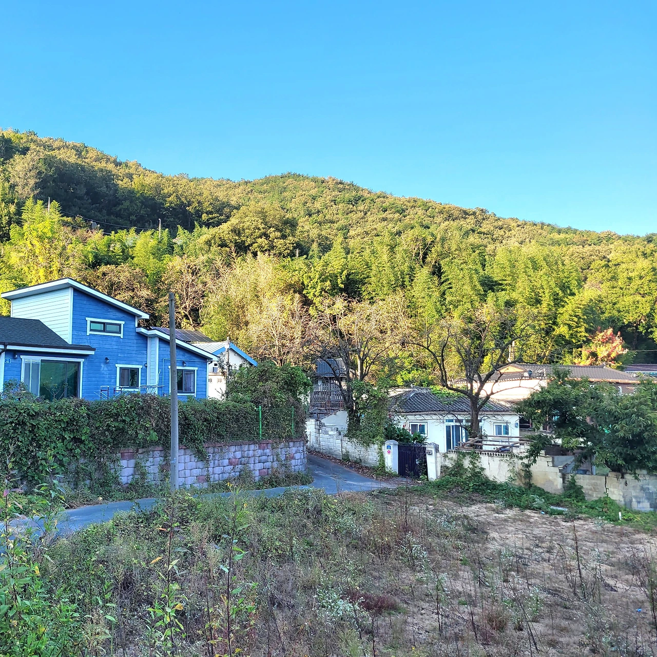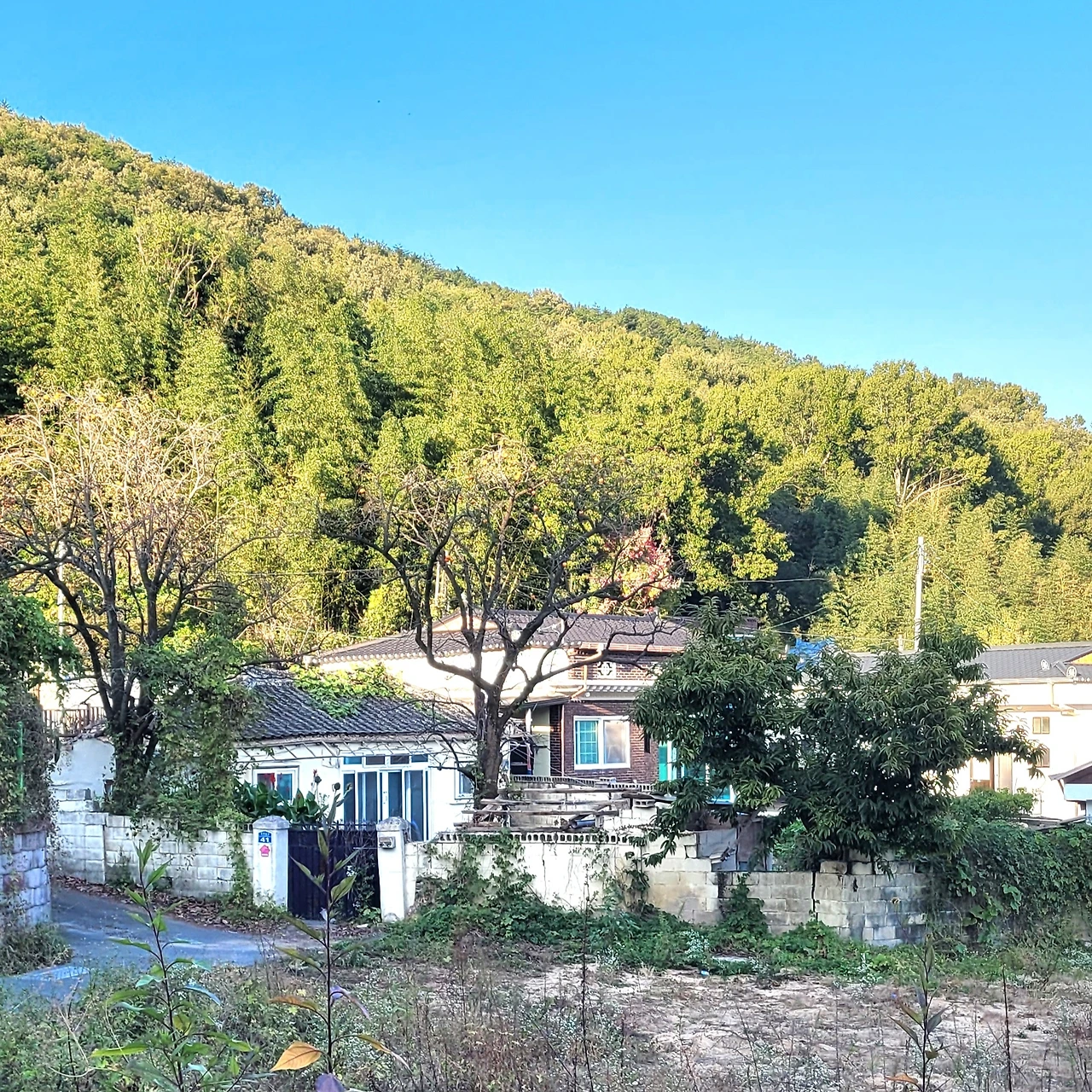 폐가가 힘들게 버티고 있는 대지 현황, 진입도로 폭이 좁아 조심해서 운전해야 한다. 서쪽에 산이 있어서 일찍 그늘이 드리워졌지만 양명한 동네이다.