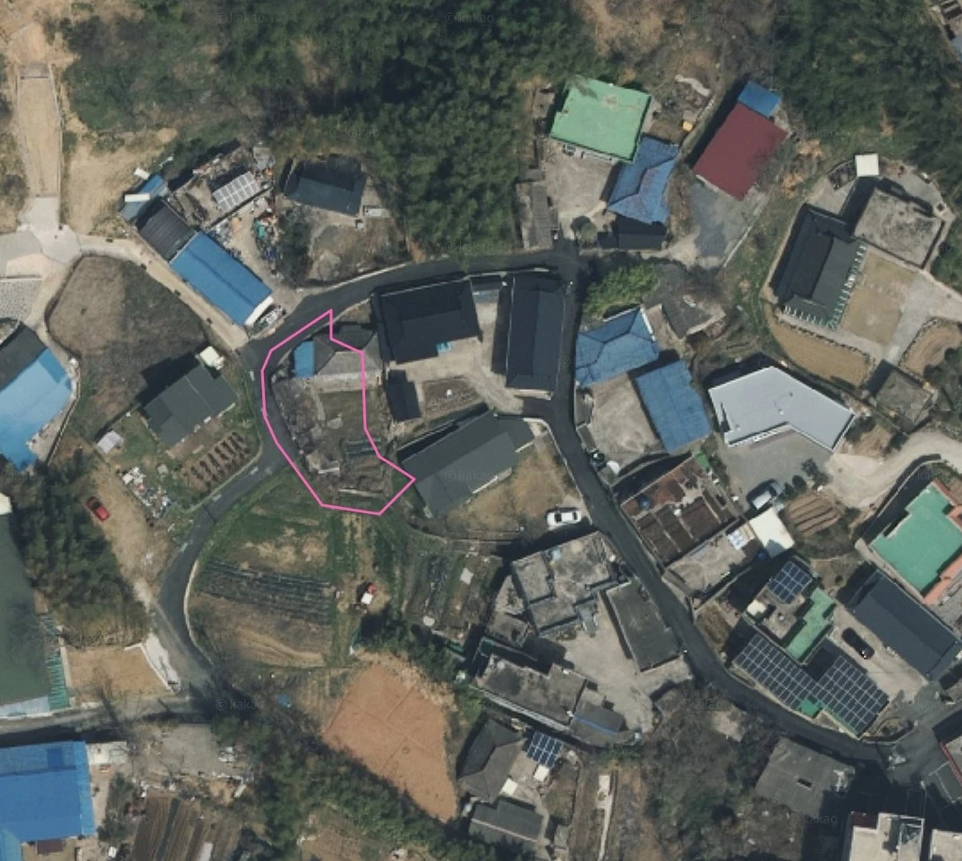 카카오맵 스카이뷰로 본 대지 주변 상황, 대지가 도로와 인접대지에 걸쳐져 있어 실사용 대지 범위가 어떻게 될지 확인이 필요하다
