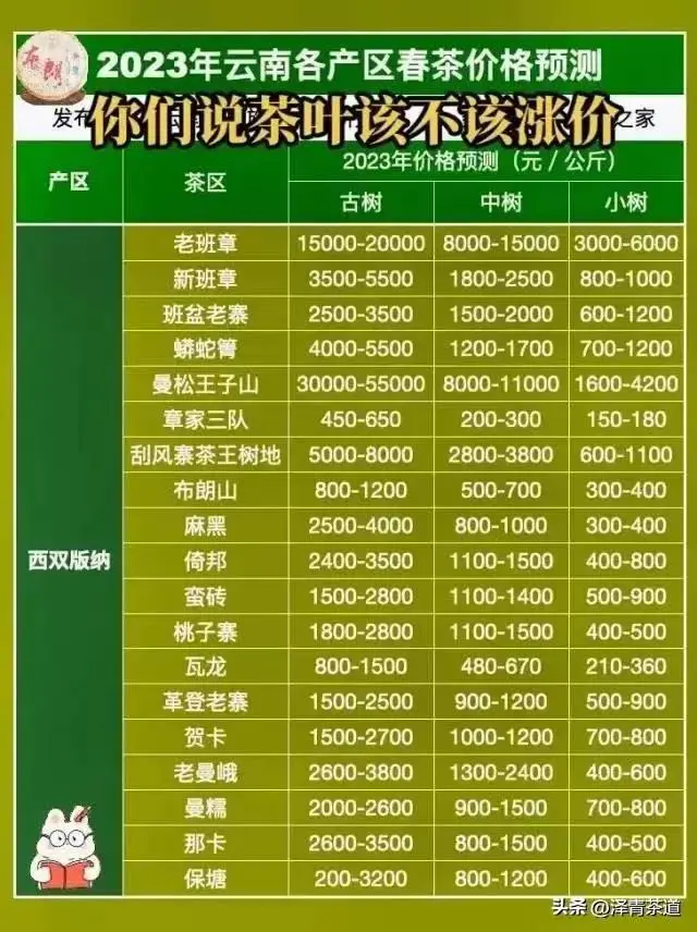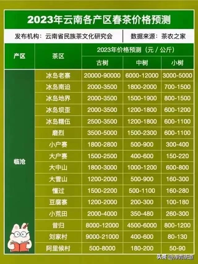 보이차를 구입하면서 차 산지를 구분하게 된 시기는 2010 년 무렵이다. 노반장을 찾는 사람이 갑자기 늘게 되면서 해마다 새로운 차산지가 소개되고 그 산지의 차의 가격이 공시되고 있다. 2023년 고수차의 모차 공시가격이 kg당으로 빙도노채가 90,000 위안, 노반장은 20,000 위안인데 비해 이가촌은 400 위안에 불과하다. 이가촌과 빙도노채의 차이는 200 배 이상이니 산지별로 얼마나 큰 차이가 있는지 알 수 있다.