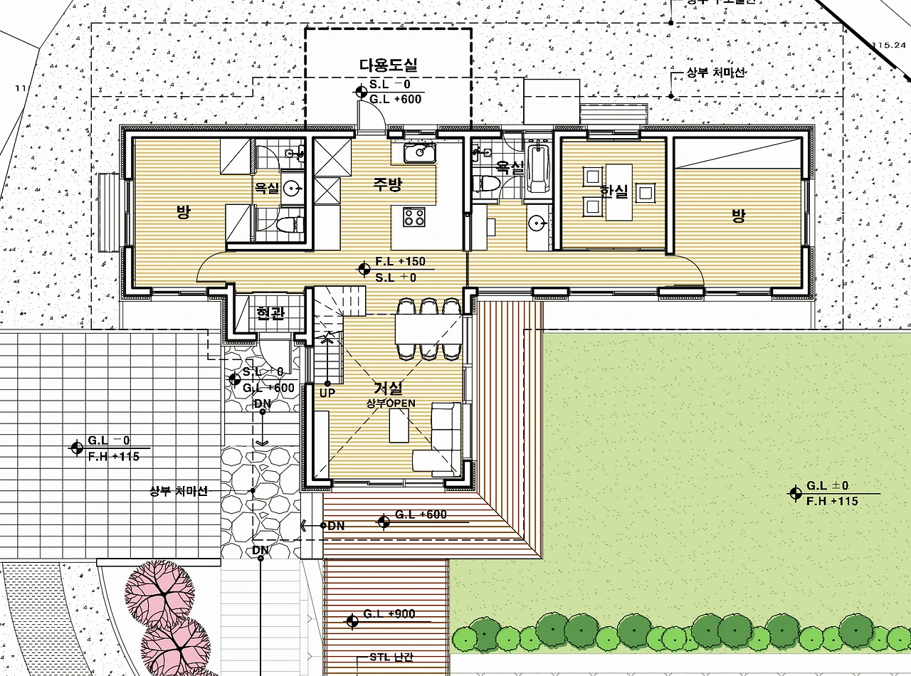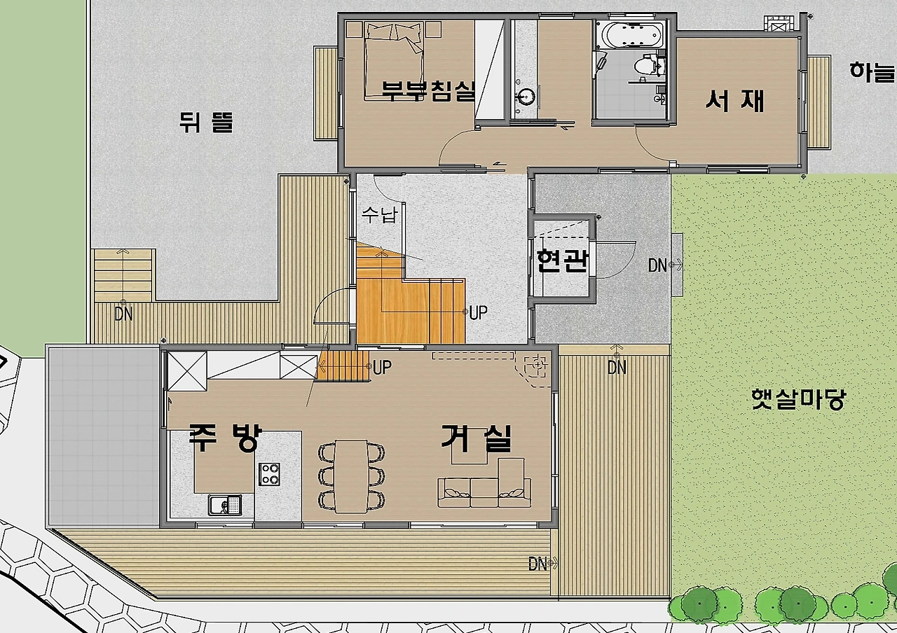 설계자의 제안에 건축주는 아예 변기까지 별도로 나누었으면 하는 바람을 얘기했다. 평면 구성상 세 군데로 기능을 분화하는 건 어렵다고 답을 드렸지만 마음이 편치 않았다. 해결 방안이 없을까 숙고하다 방의 위치를 바꾸니 건축주의 바람이 뜻을 이루게 되었다.