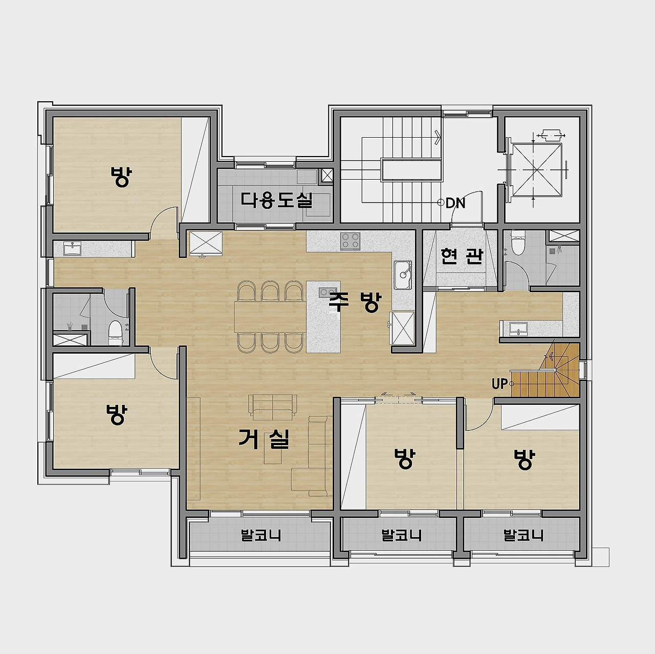 차라리 욕실을 하나만 두고 면적을 더 줘서 기능을 분화하는 게 좋지 않을까 싶다. 몸을 씻는 욕실, 몸을 단장하고 양치질을 하는 파우더룸, 용변을 보는 화장실로 구분하면 어떨까? 아마도 3~4인 식구가 사는 집에서 동시 사용을 고려하더라도 크게 불편함이 없을 것이다. 습식 공간이 욕실에만 한정되니 청소에 대한 부담도 줄고 편의성은 커지게 된다.