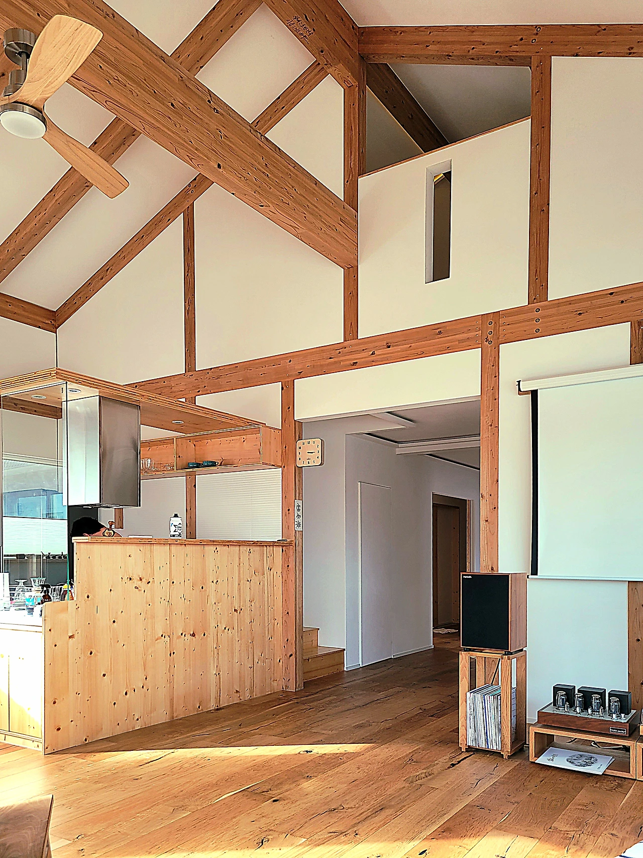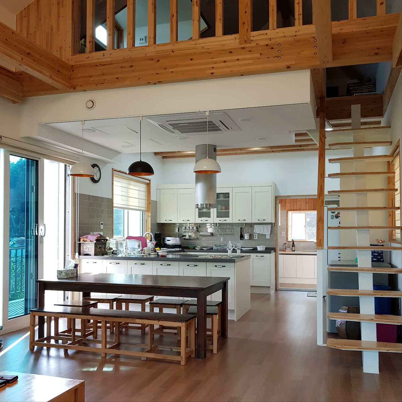 필자 설계 경남 양산 심한재-경사지붕이 있어서 얻을 수 있는 거실의 깊은 공간감이 좋은 집이다