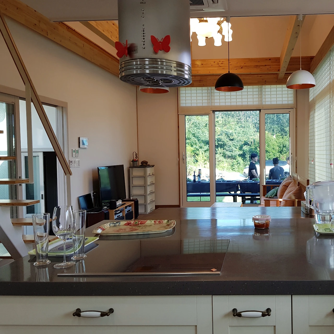 윗장이 없이 오픈된 싱크와 조리대는 상판에 여유가 많다. 커피머신, 믹스기 등 가족의 즐거운 일상을 지원하는 기구가 놓일 것이다. 아일랜드 조리대의 전기레인지에서 된장찌개가 끓고 식구들은 탁자에 앉아 즐거운 식사 자리를 기다리고 있다.