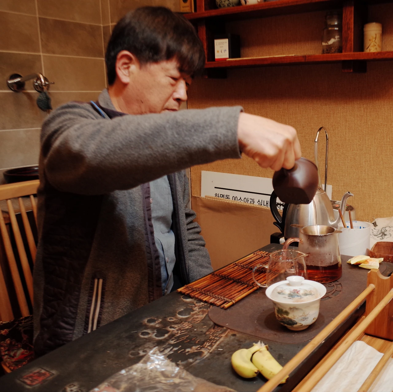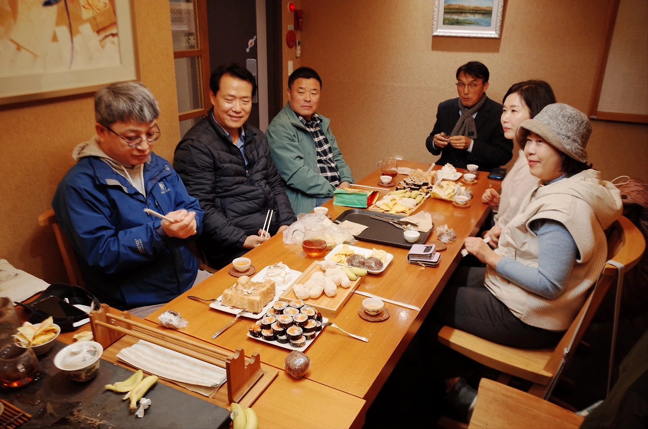 다식과 함께 김밥으로 배를 채우고 이제 차를 마십니다. 빙도홍을 먼저 마셨는데 여느 홍차와 다른 풍미에 빙도의 명성이 그냥 만들어진 게 아니라고 입을 모읍니다. 그다음은 우전 발효차인 섬진노을을 마시는데 우리 발효차도 이런 향미를 낼 수 있는지 감탄하게 됩니다.