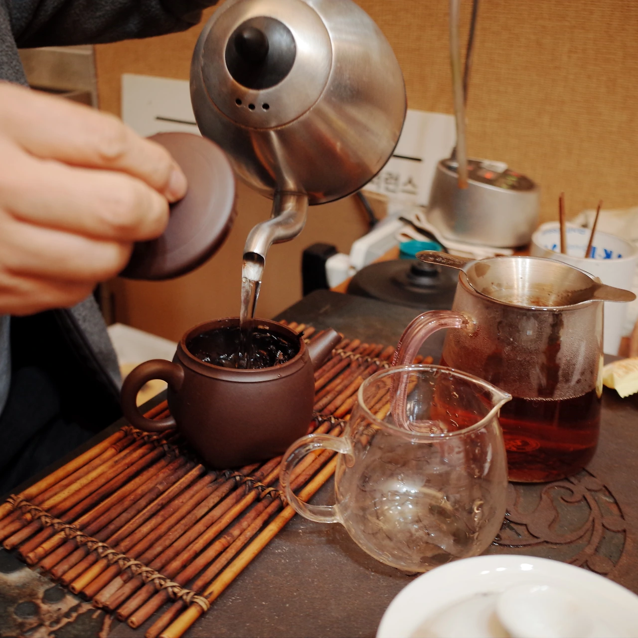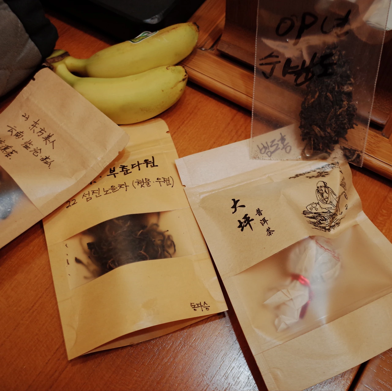번외로 오늘 게스트로 참석한 도원님이 준비해 온 라오스 야생차를 마십니다. 야생차는 강한 차기가 특별한 향미를 보여주는데 이 차는 채엽을 계속해서 그런지 차기가 꺾여 첫물고수차의 부드러운 향미를 보여줍니다. 수백 년 수령의 차나무라 하는데 부드러운 향미가 좋았습니다.
