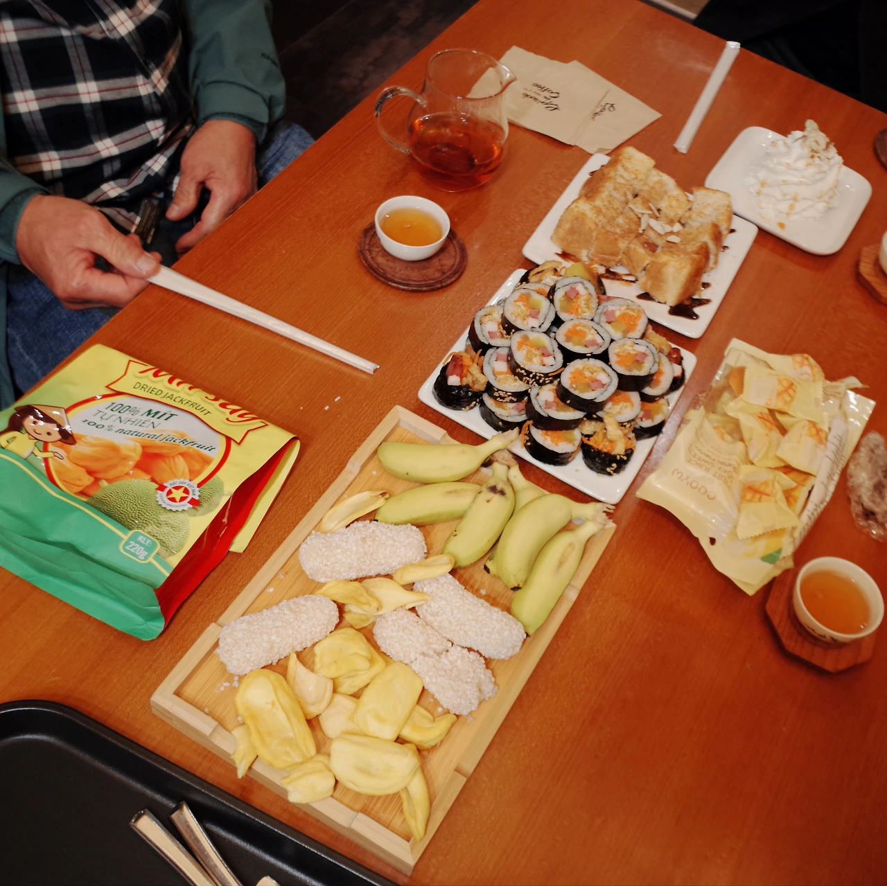 또 다우들께서 다식을 손에 손에 들고 와서 다연회 분위기로 만들었습니다. 산수유님이 모시고 온 게스트 분이 열대 건과일, 열대과일 젤리, 산수유님이 몽키 바나나를, 대명님이 유과와 떡을 가져와서 에피소드인커피 제공 김밥과 허니브래드를 남겼습니다. 다식을 챙겨 와 주신 다우 분들 고맙습니다.
