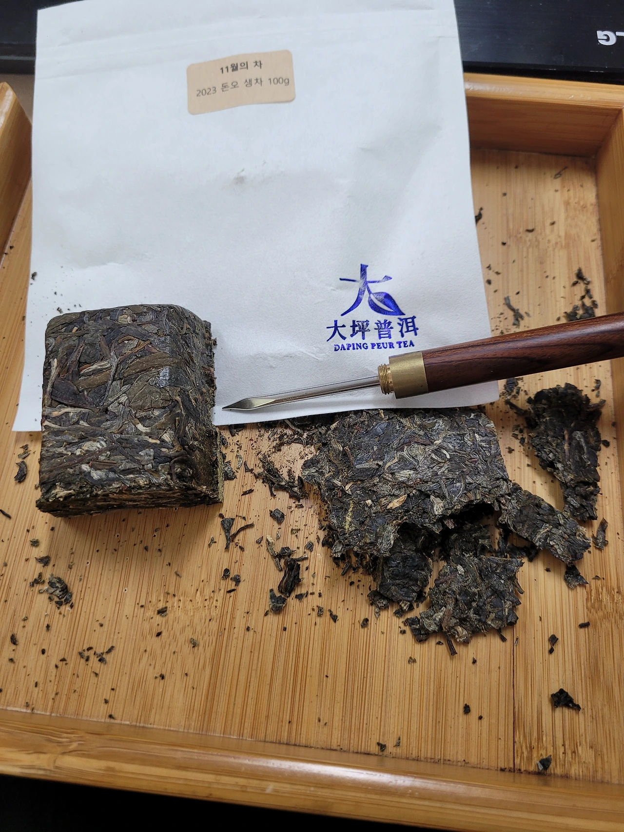 돈오는 23년 또부짜이 산토차 두춘70%, 22년 동궈두춘30%로 만들어졌다고 합니다. 두춘차는 첫물차를 이르는데 두 곳의 산지는 모차의 가격을 맞출 수 있었나 봅니다. 차를 마셔보니 쓴맛과 단맛이 조화를 이루어 일상 차로 마시기에 부족함이 없을 듯합니다.