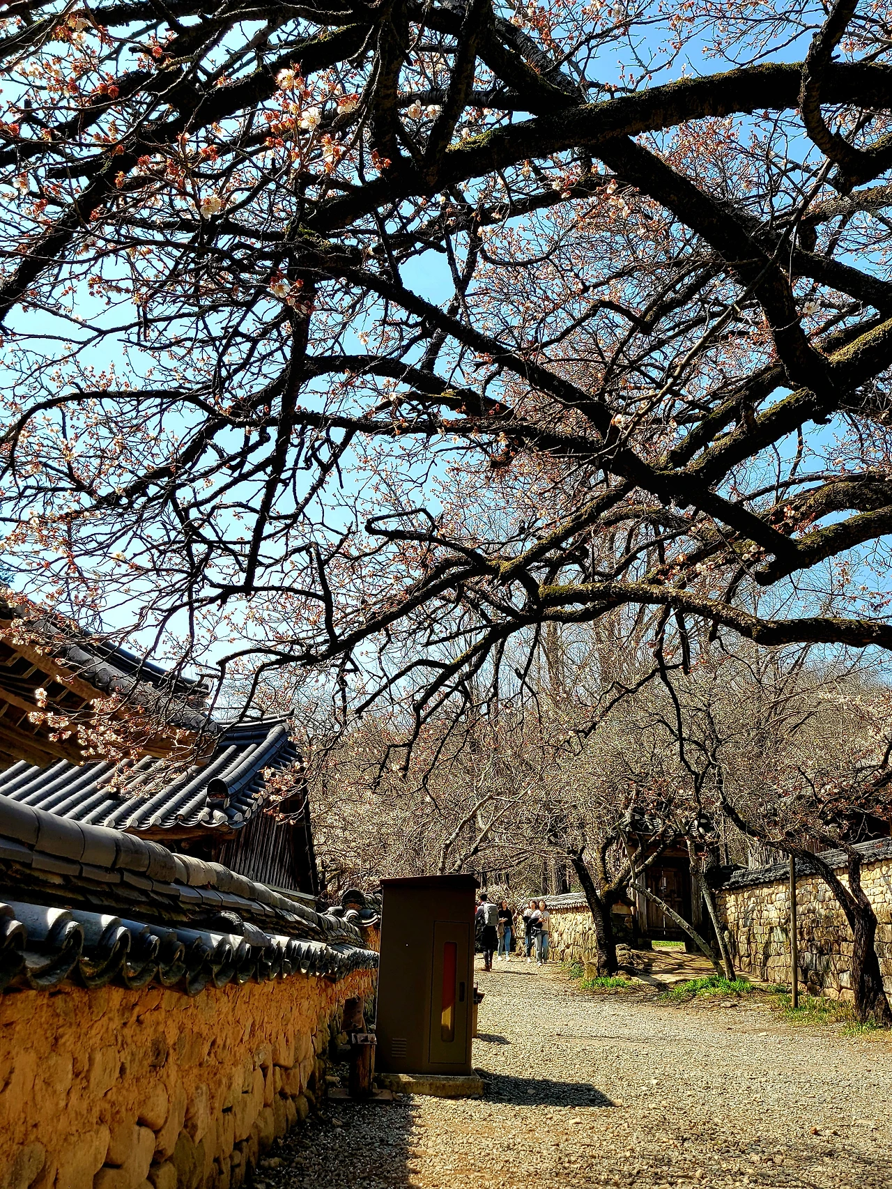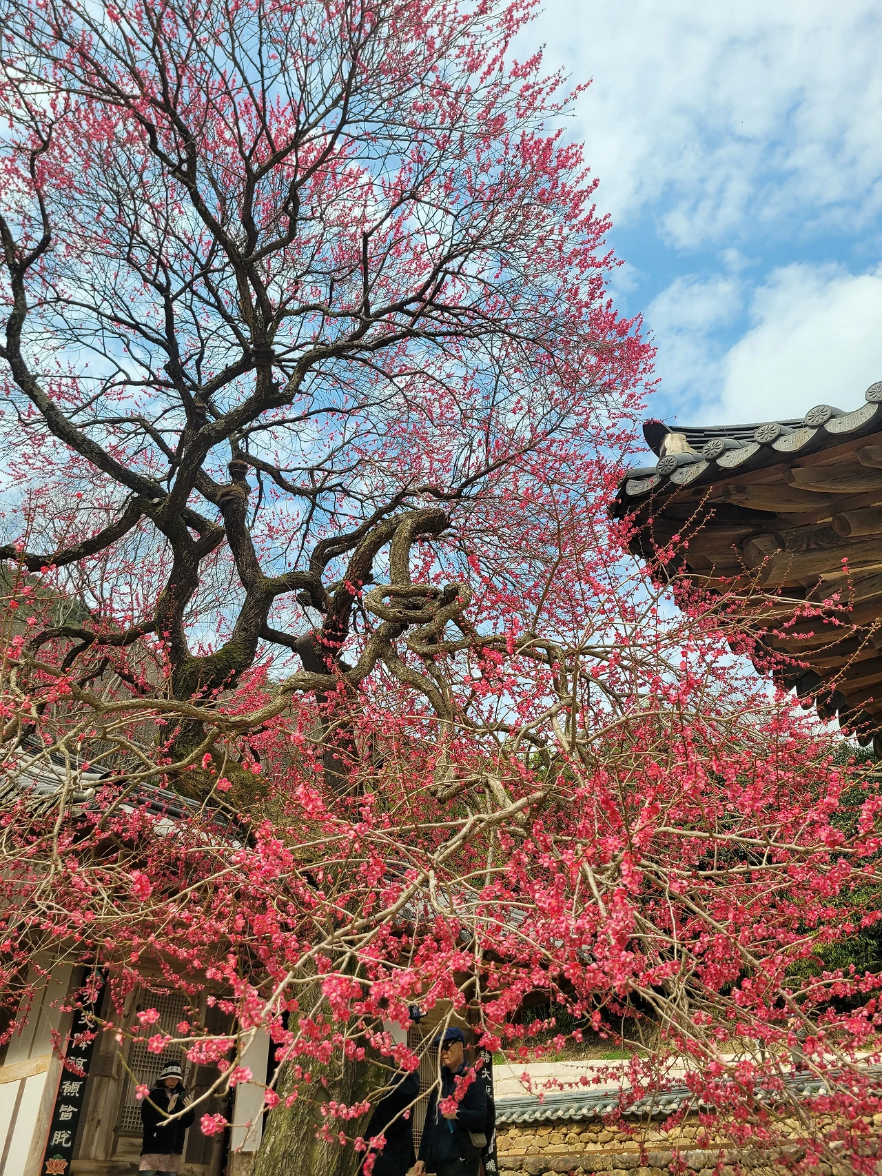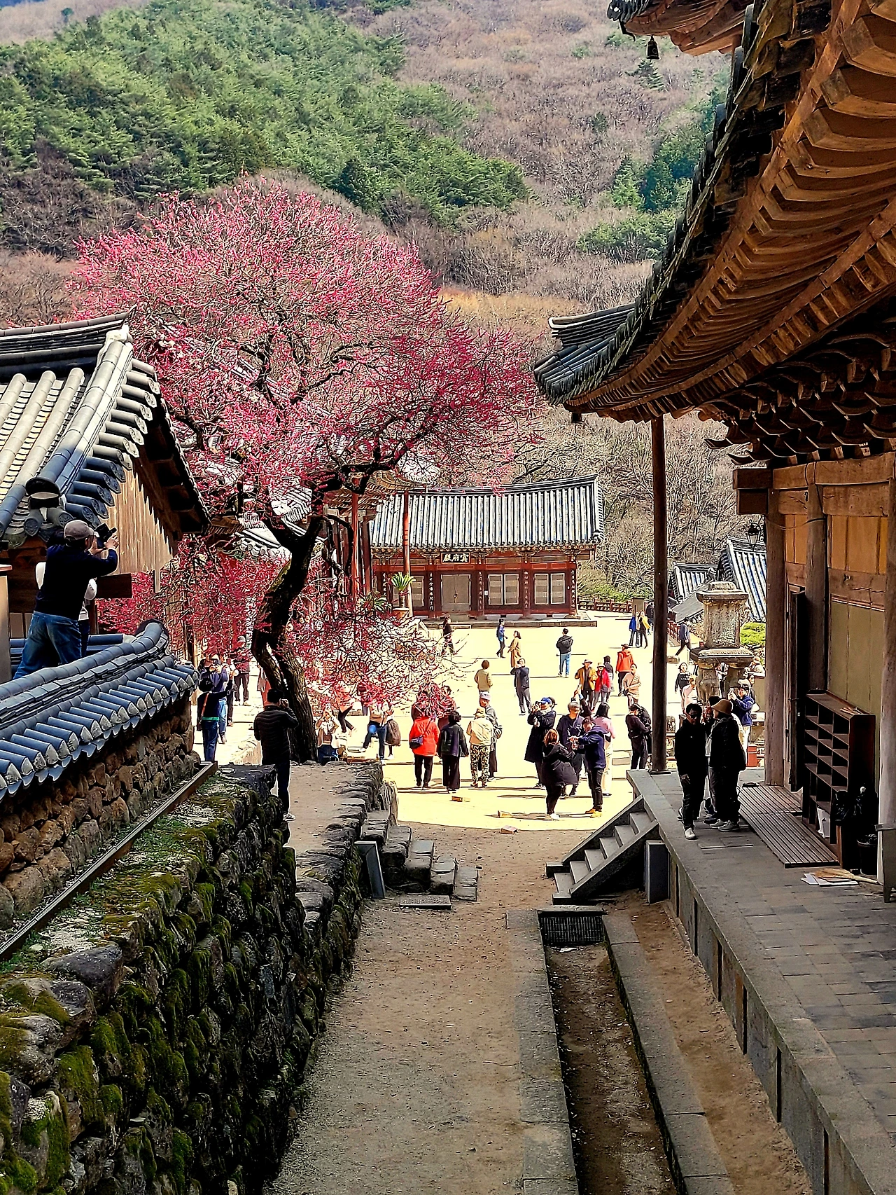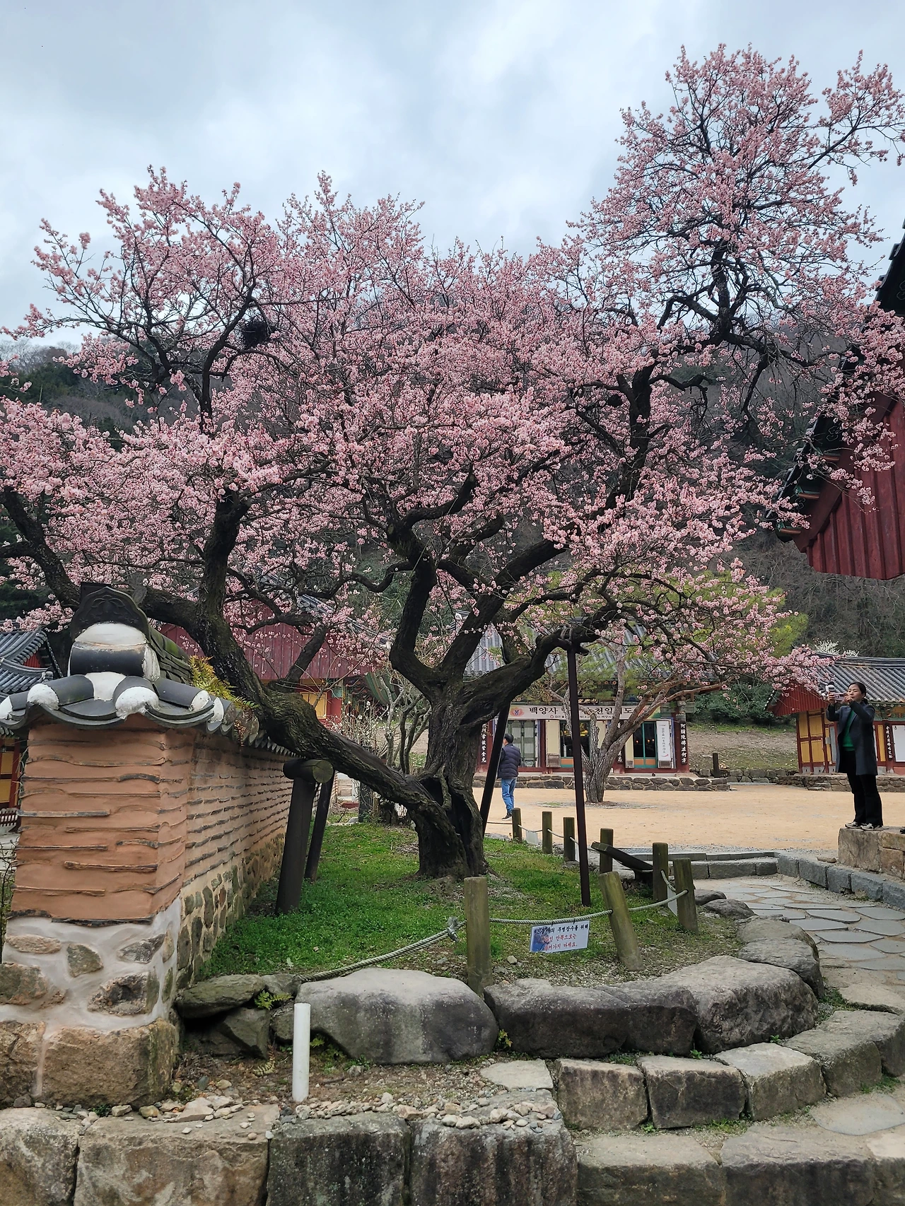 분홍색 매화가 만개한 고불매는 절 한쪽에 비켜서 차분하게 자리하고 있었다. 꽃이 피어 사람들의 시선을 한 몸에 받고 있지만 꽃이 지고 나면 고목 한 그루의 모습에 지나지 않을 것이다. 화엄매는 나무의 키 높이로도 존재감을 드러낼 만 한데 고불매는 350년의 오랜 세월을 가만히 담고 있을 뿐일 듯했다.