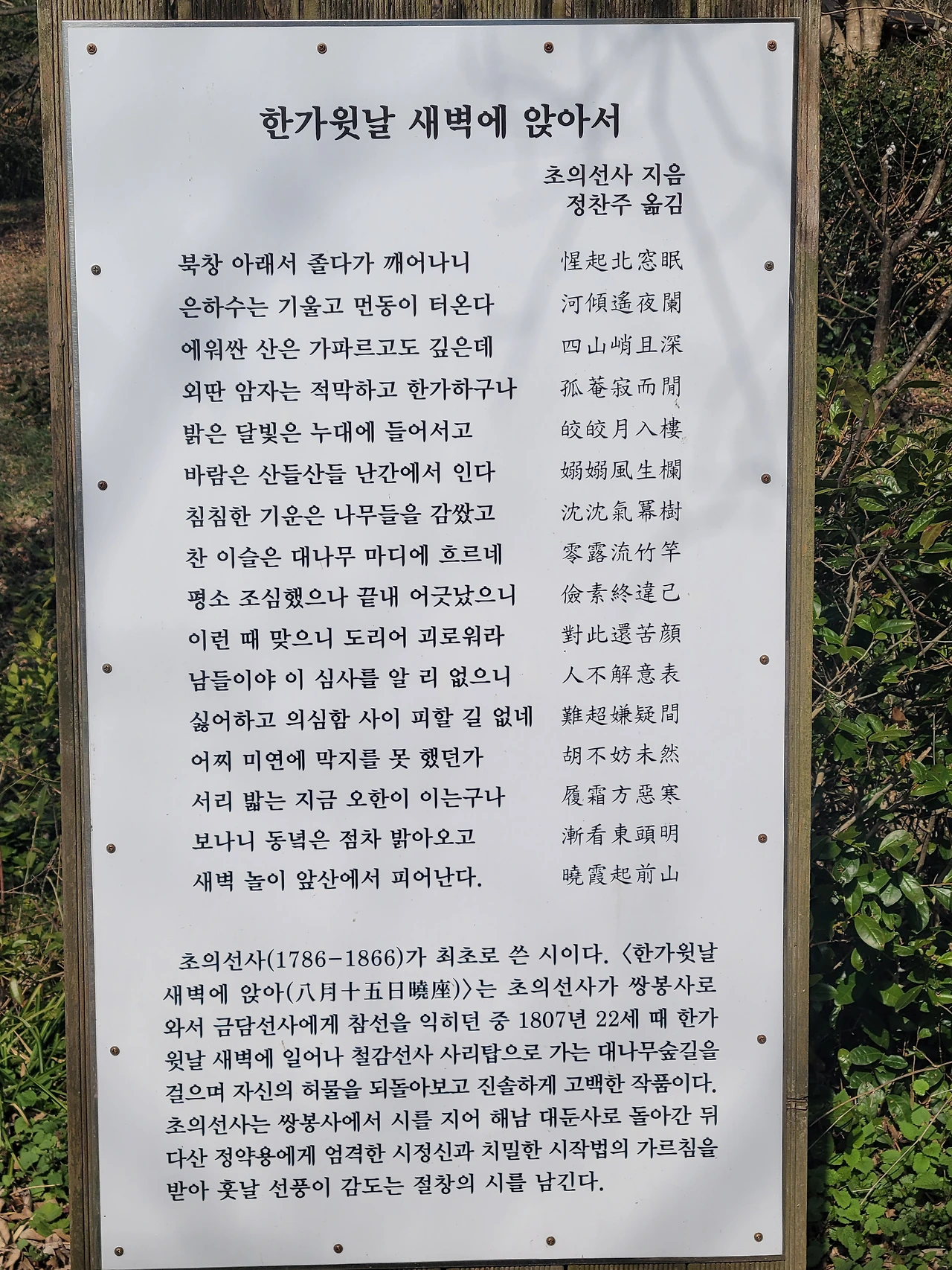쌍봉사의 창건주인 철감선사 부도와 부도비가 있는 자리로 오르는 길 옆에 차밭이 있었다. 차나무가 수십 그루 자라고 있었지만 따로 돌보지는 않아 보였다. 차 마시는 사람이 아니라면 여느 나무와 다르게 보지 않겠지만 차나무가 있어서 반가웠다. 쌍봉사는 초의스님이 이십 대에 머물렀는데 철감선사 부도로 오르면서 그가 처음 읊었다는 시가 적힌 현판이 차밭 입구에 세워져 있다. 우리나라 차인을 대표하는 초의스님과 인연이 닿는 곳인데 차 한 잔 할 곳이 없어 안타까운 마음이 들었다,